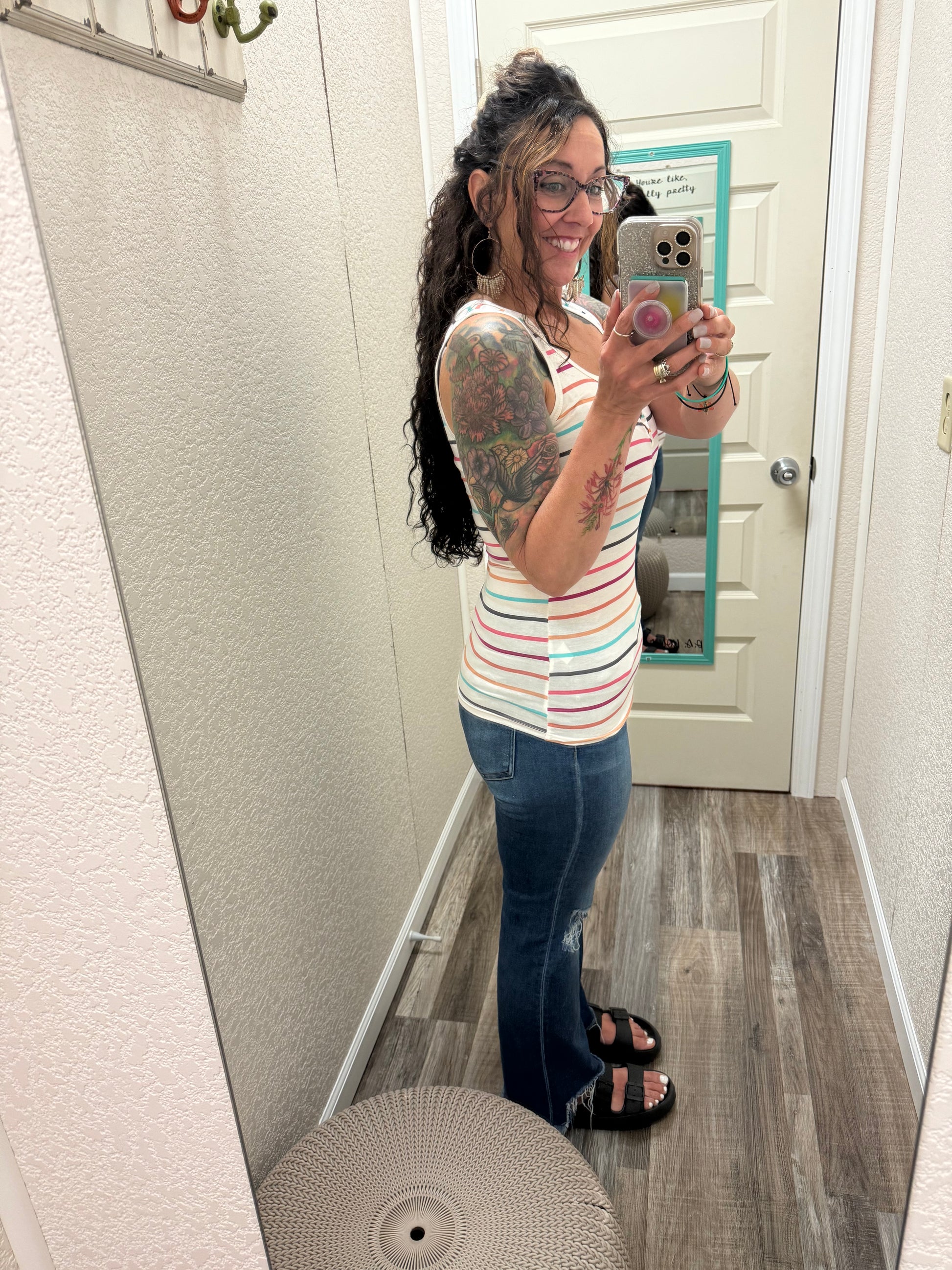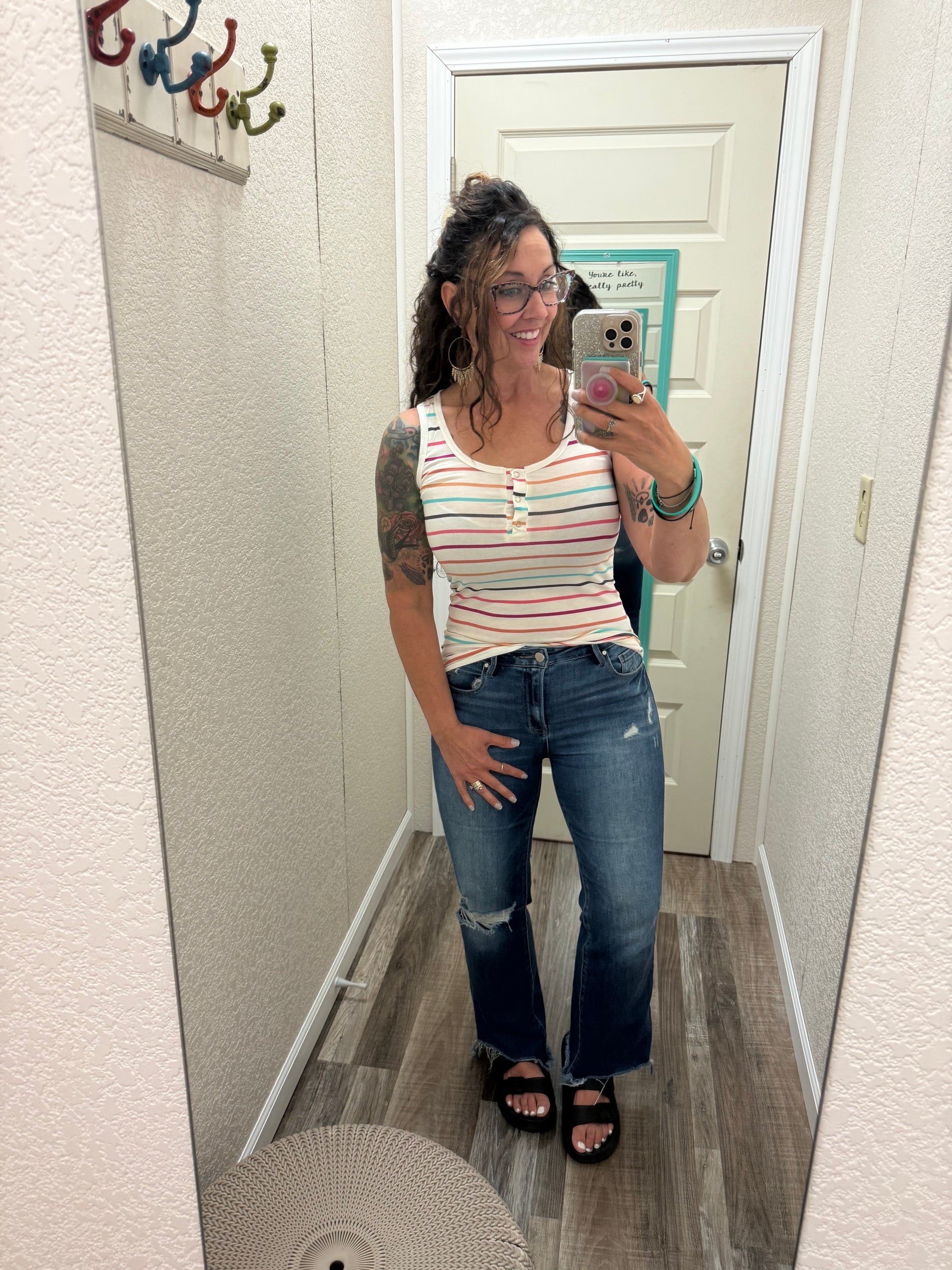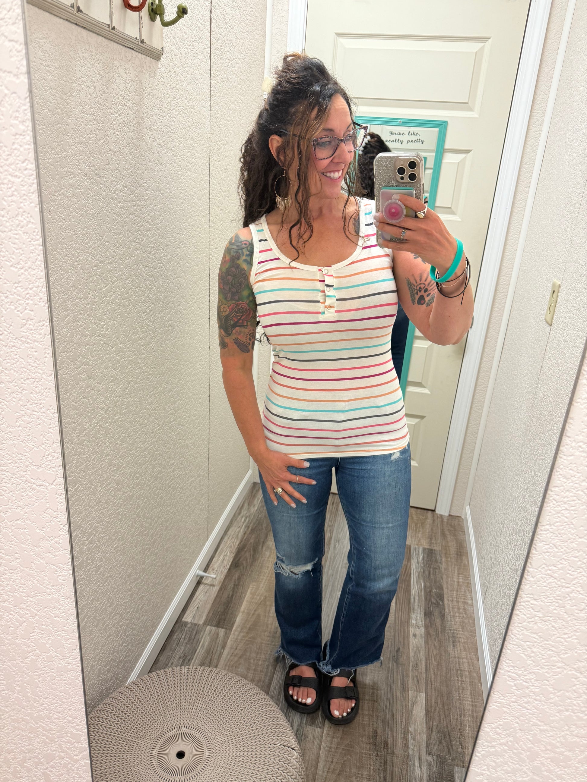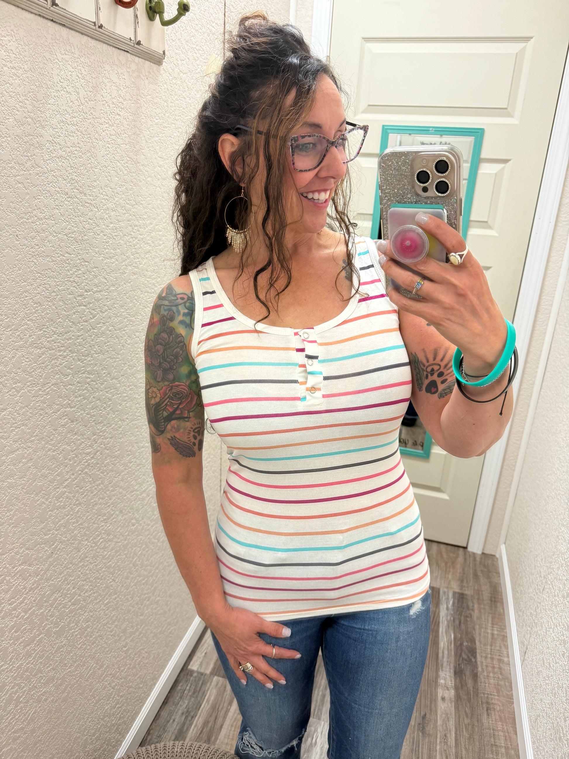 Upgrade your summer wardrobe with the All The Happy Feels Striped Tank Top. The fitted design flatters your figure, while the bright multicolor stripes add a touch of fun. Featuring a convenient chest snap button, this tank top is both stylish and functional. Perfect for any casual occasion.