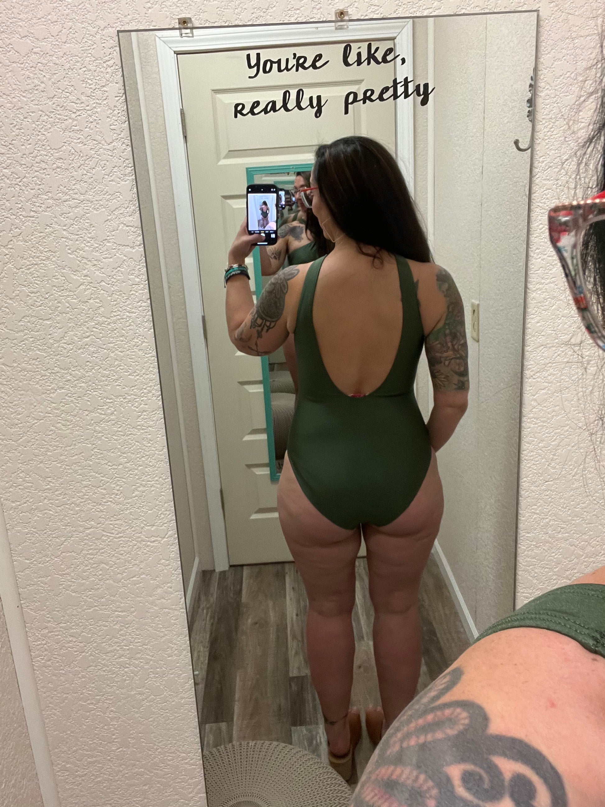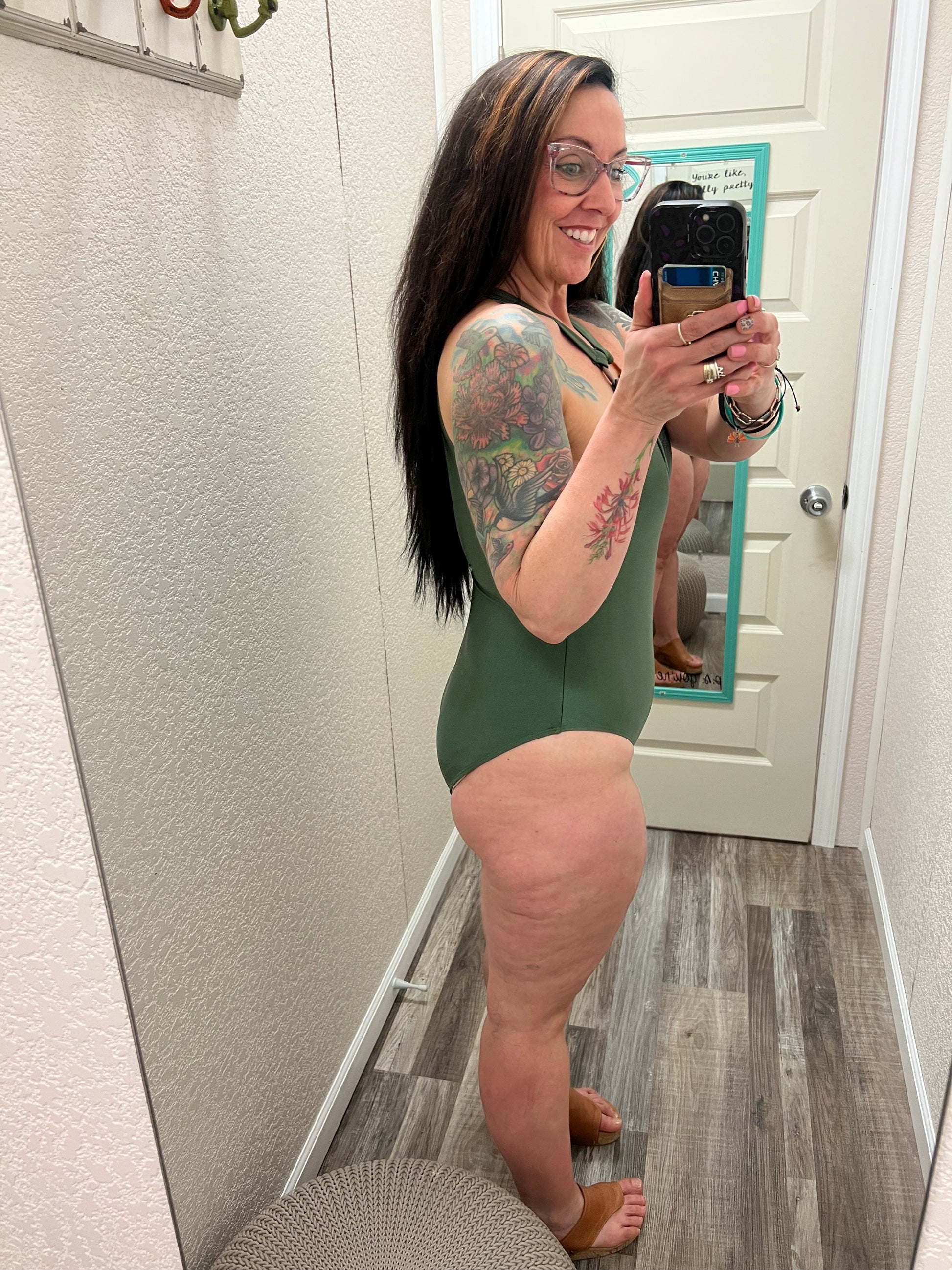 Experience the ultimate beach bliss with our olive swimsuit adorned with a luxurious tortoise ring. Feel confident and stylish in this unique design. Perfect for lounging by the beach or pool. Upgrade your swimwear collection with our Beach Bliss Swimsuit.