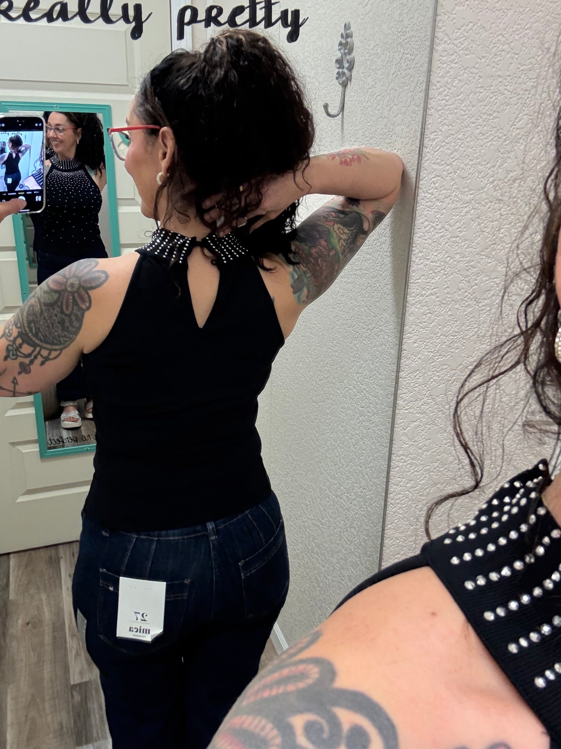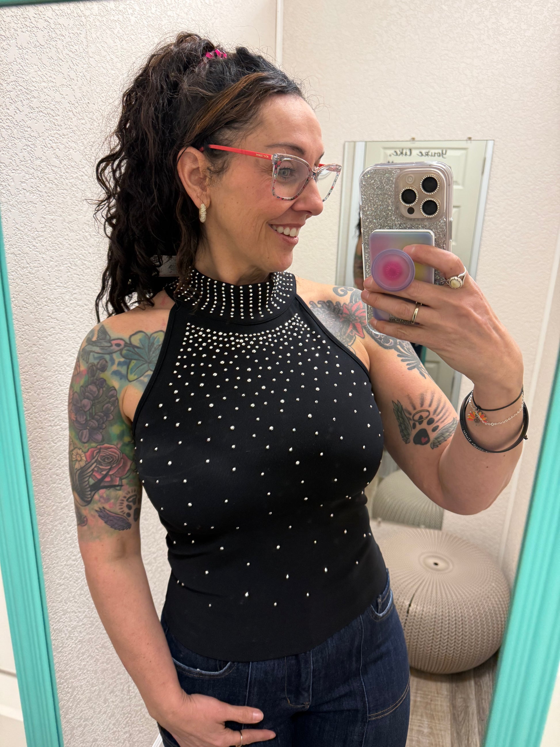Melinda is a lightweight knit turtleneck that adds a touch of elegance with rhinestone detailing on the neck and body. Designed for comfort, it's true to size and perfect for any occasion.