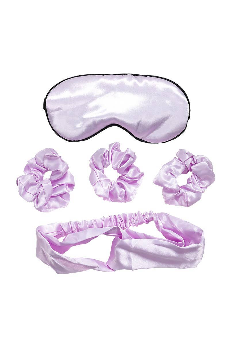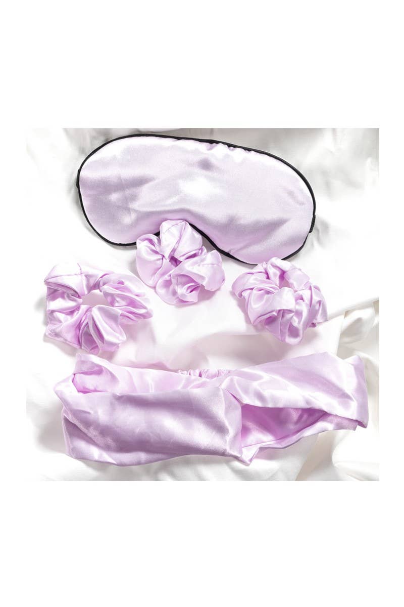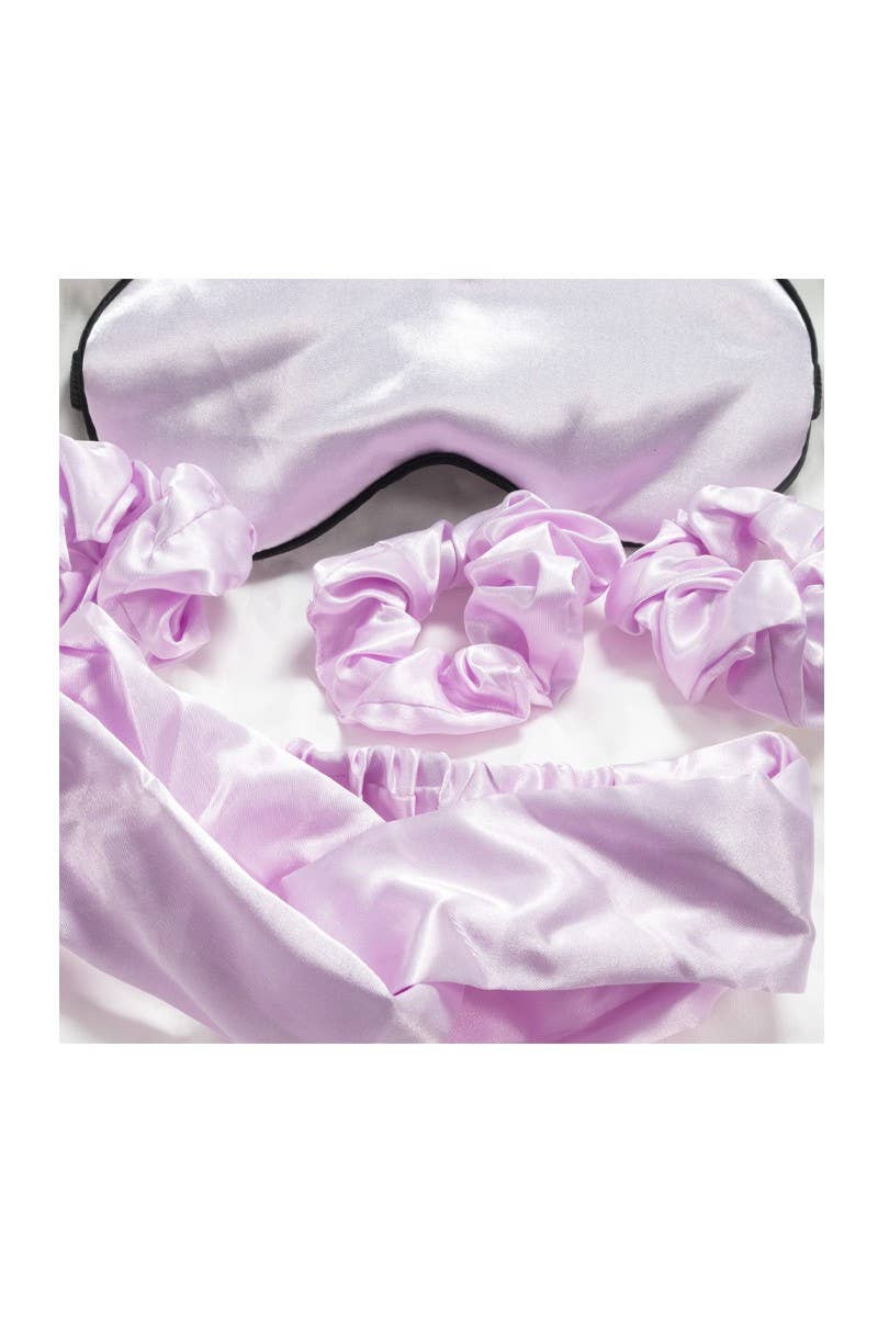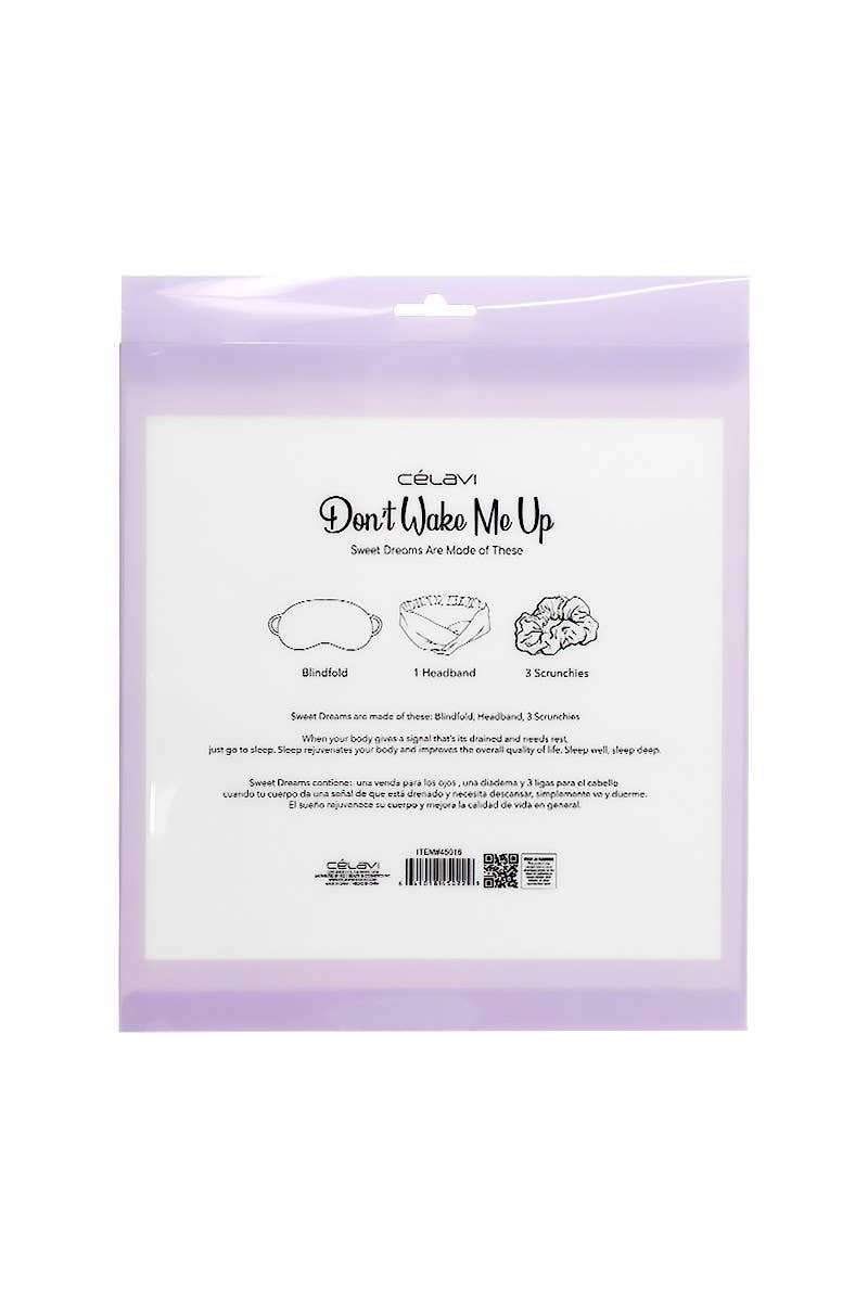 Don't Wake Me Up Sweet Dreams Sleep Set in Lavender. Features a 3 pc set that includes a satin blind fold, 1 headband, and 3 soft hair scrunchies. Soft satin fabric is gentle on the skin and hair and does not cause any discomfort during relaxation mode.