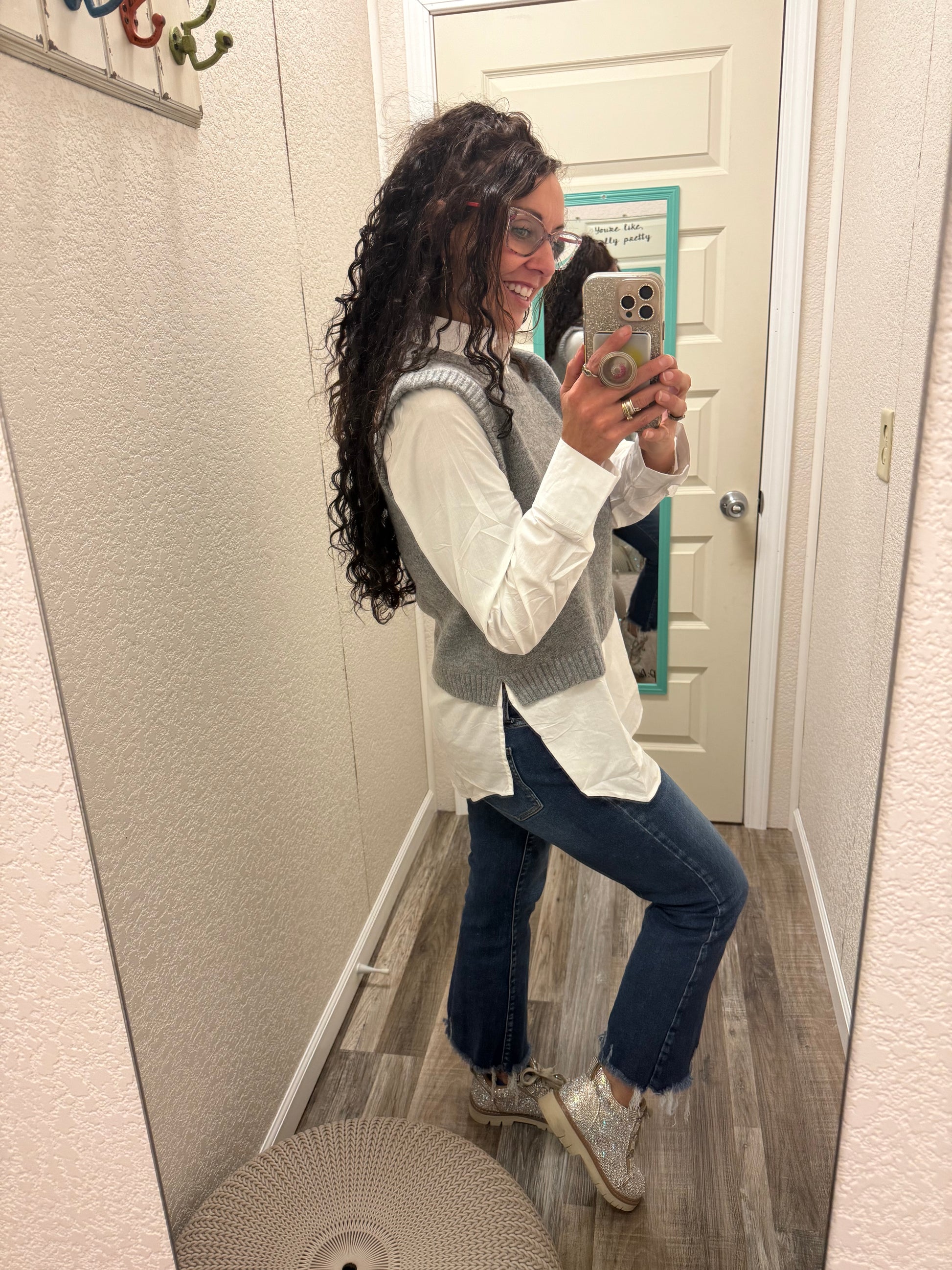 Cher Sweater Vest With Stretchy White Button Down Combo