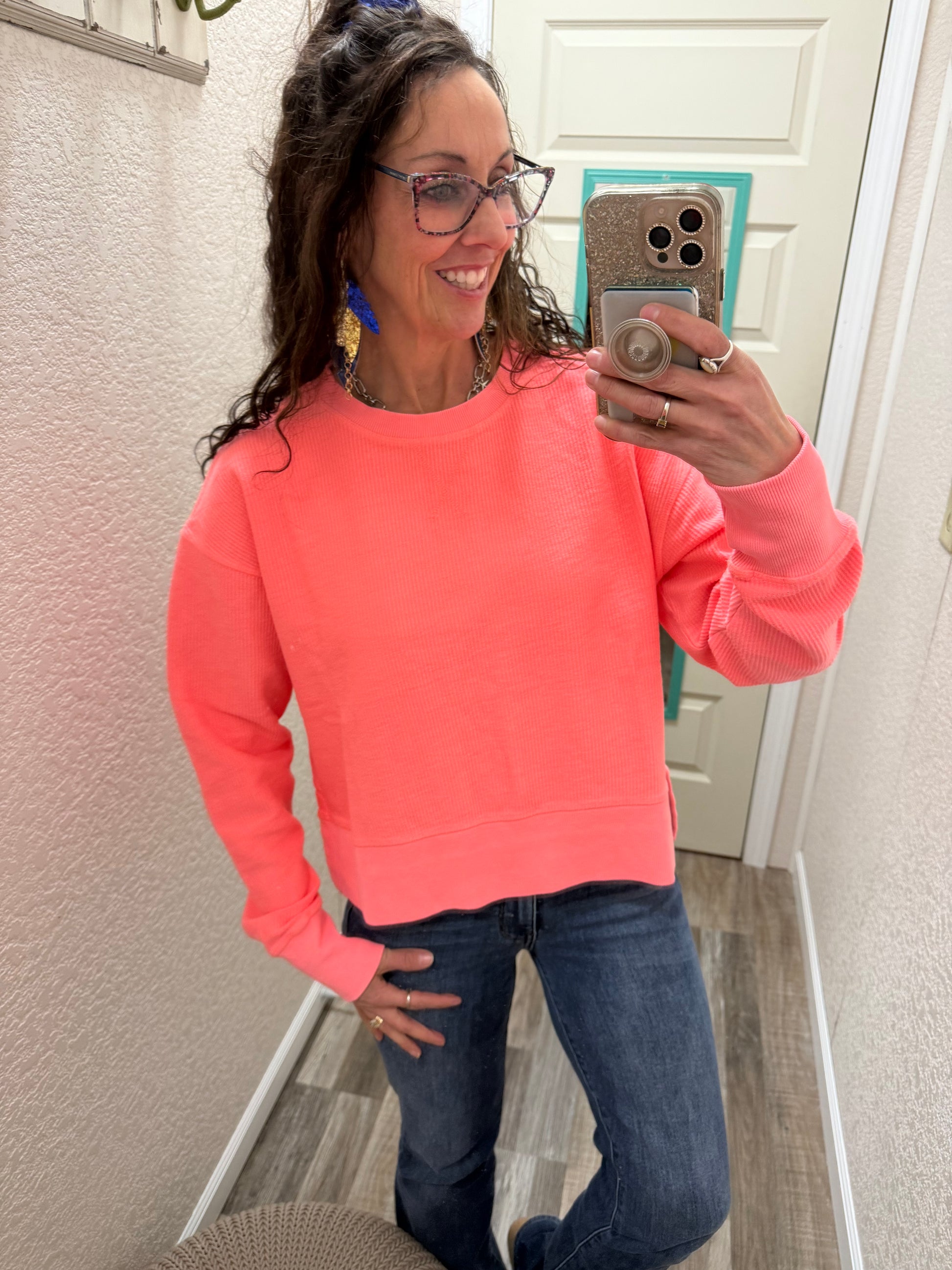 NEON CORAL Luxe CORDED CREW With Side Slits