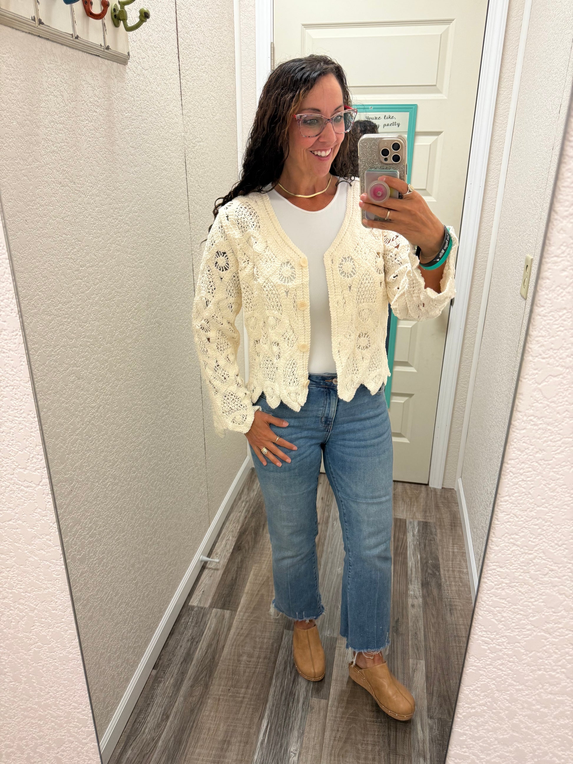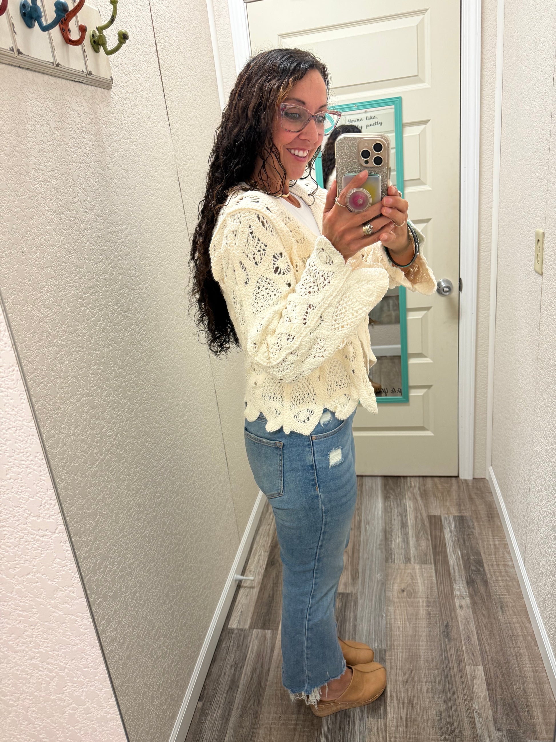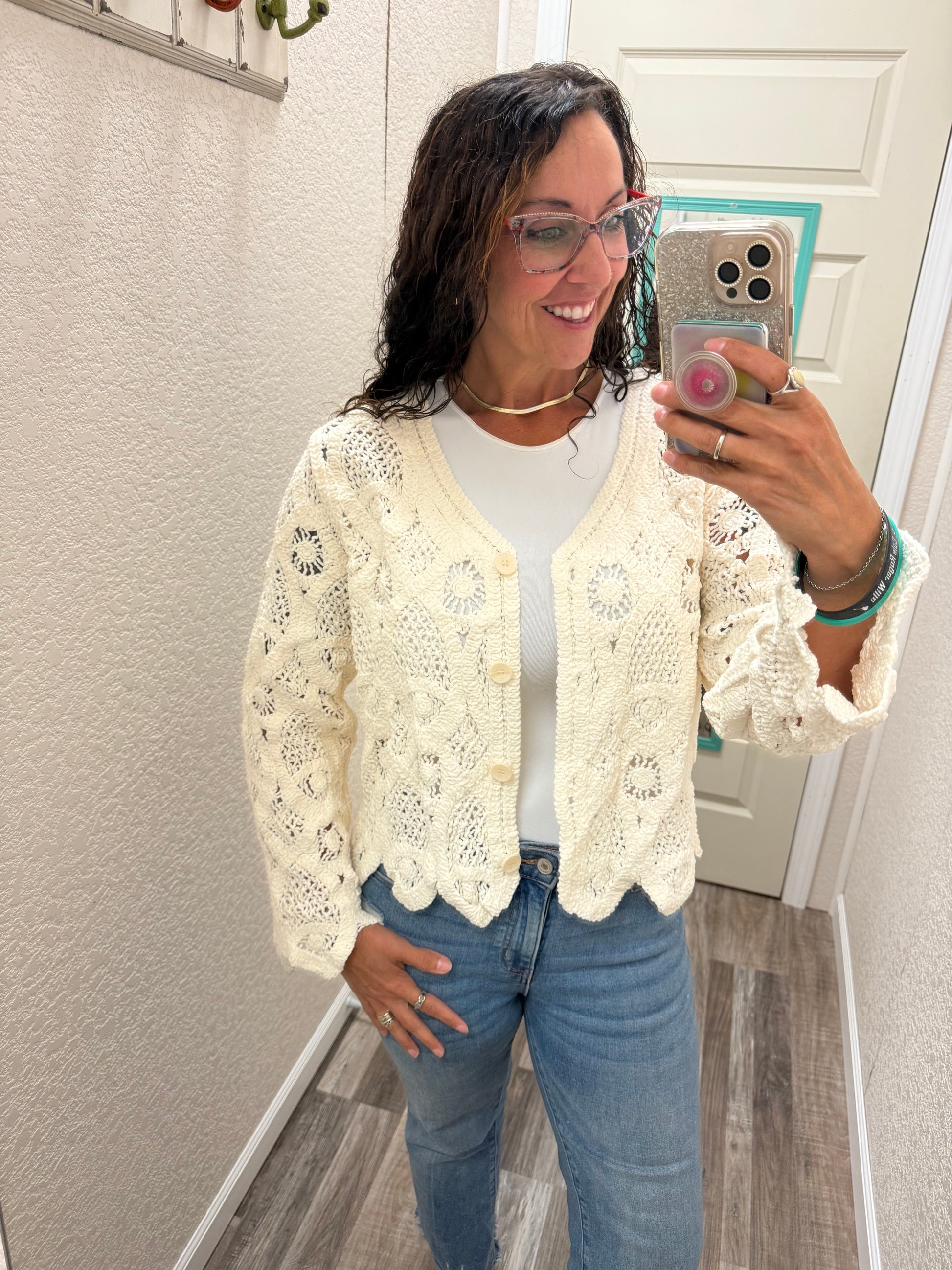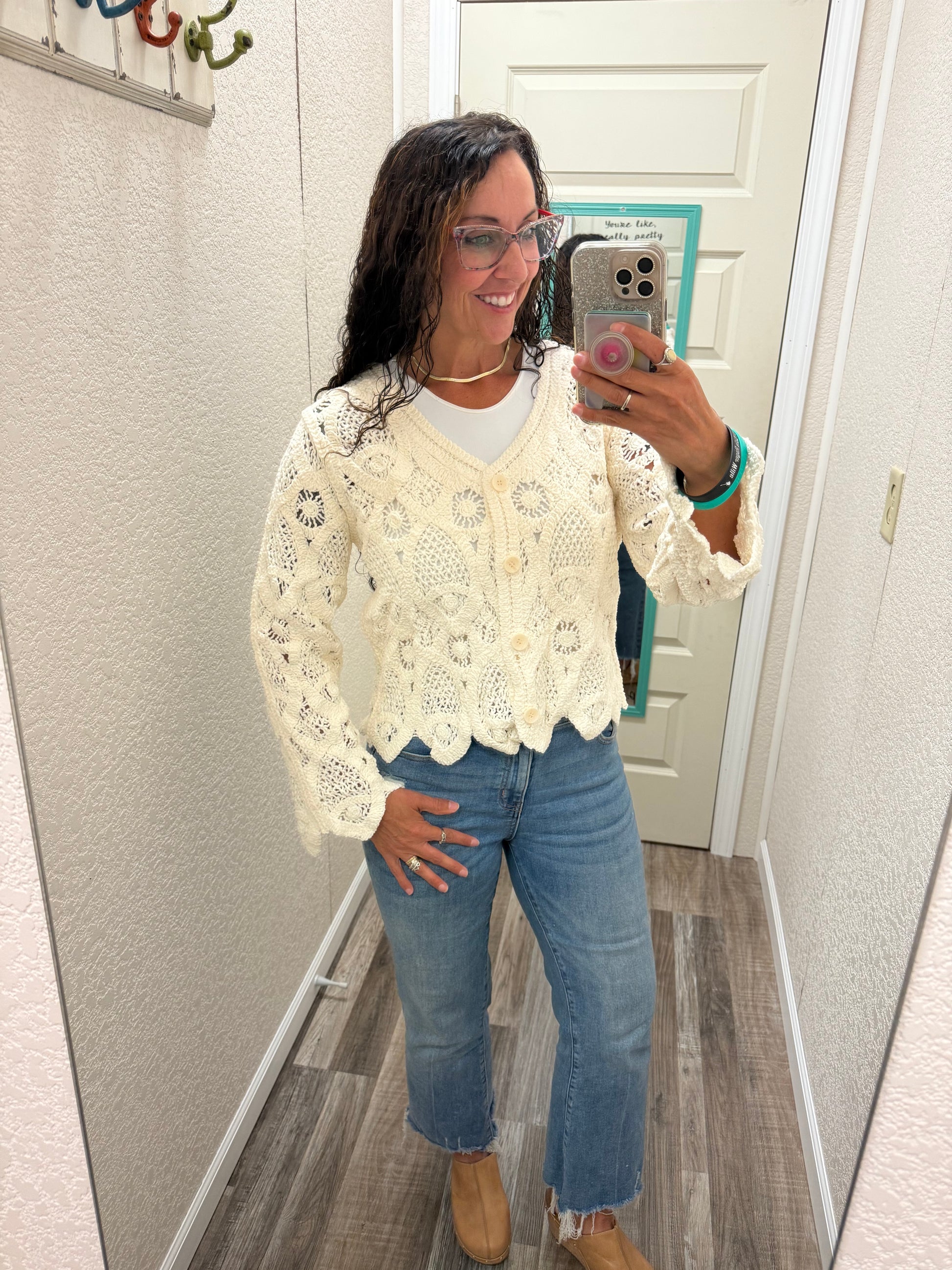 Expertly crafted with a delicate crochet design, the Denali Long Sleeve Crochet Cardigan offers both style and comfort. Its V-neck and long sleeves provide versatility for any occasion. Elevate your wardrobe with this timeless piece.