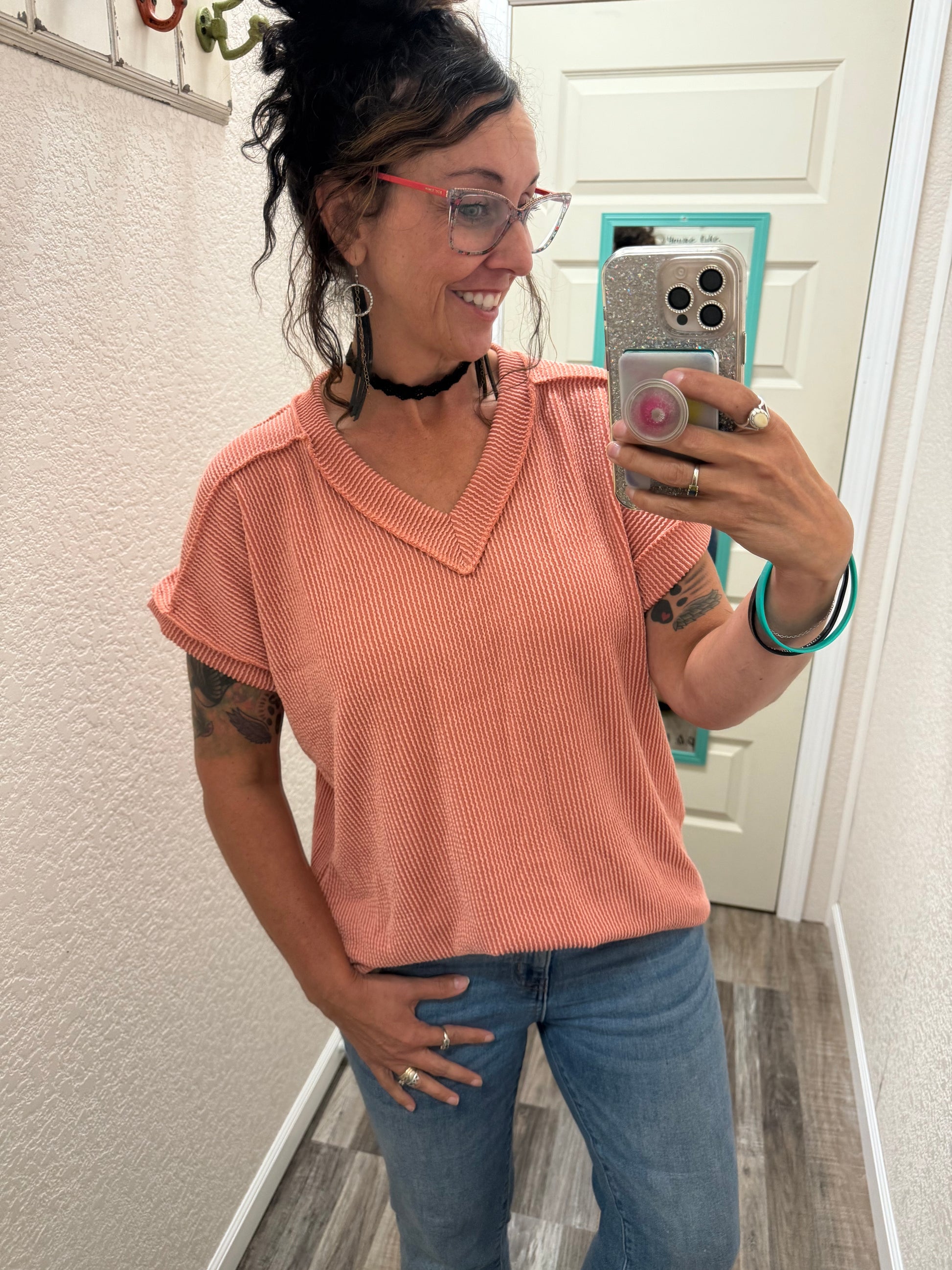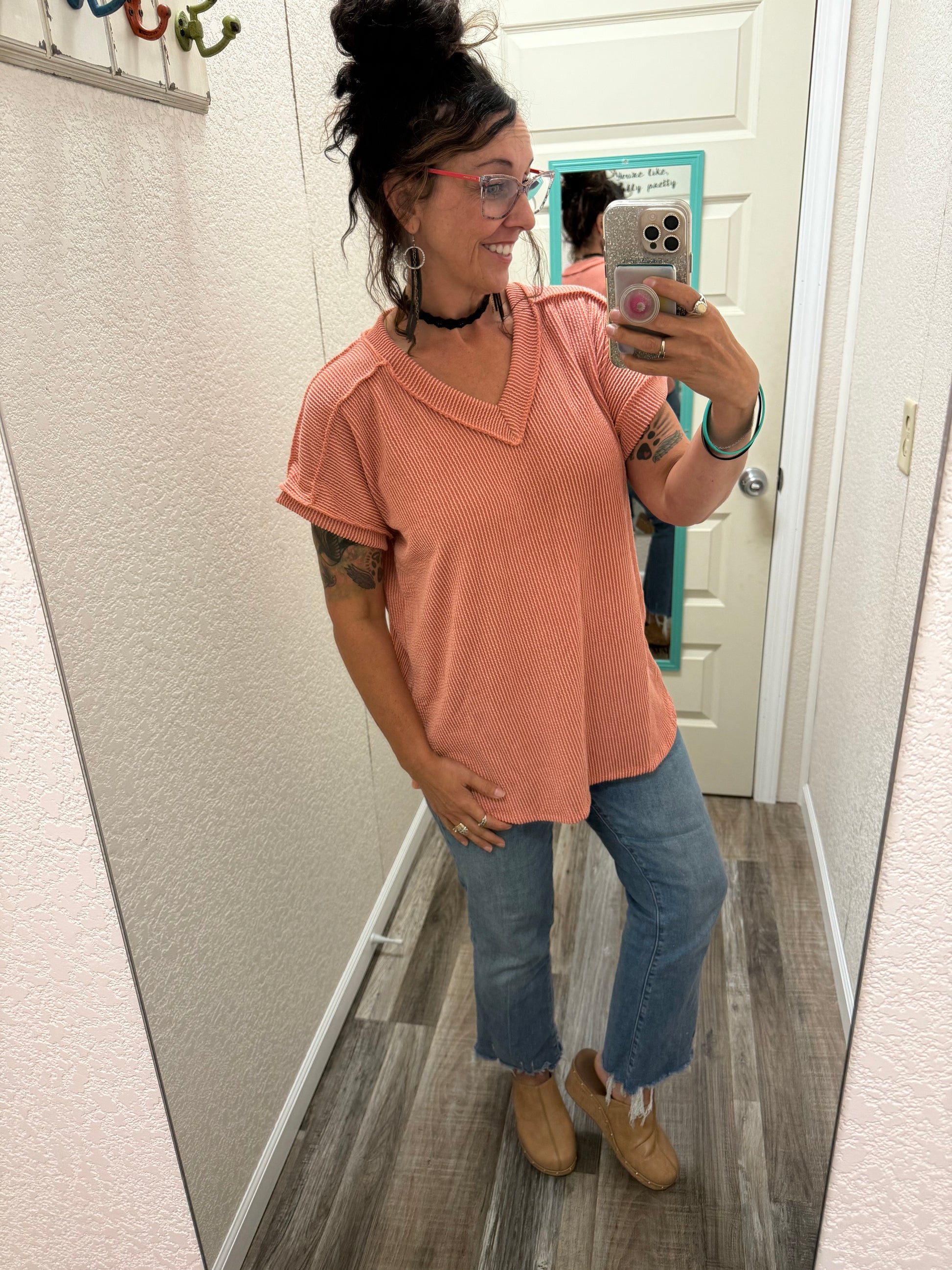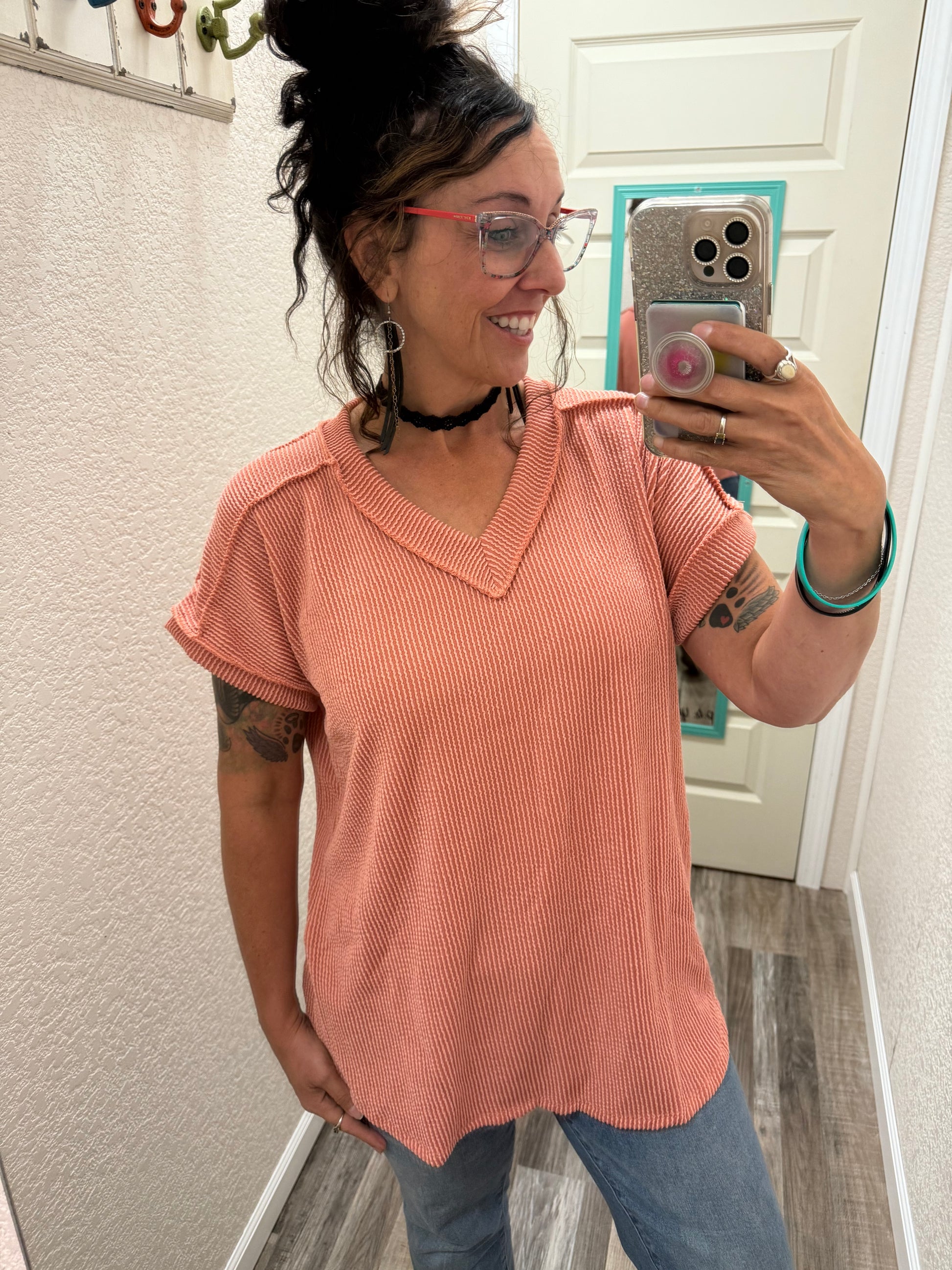 Expertly crafted from a blend of 95% polyester and 5% spandex, the Peach Courtney Corded V neck is a versatile addition to any wardrobe. With its dolman short sleeves and ribbed design, this top offers a comfortable and stylish fit. The band V neck and round hem with stitch detail add a touch of sophistication to any ensemble.