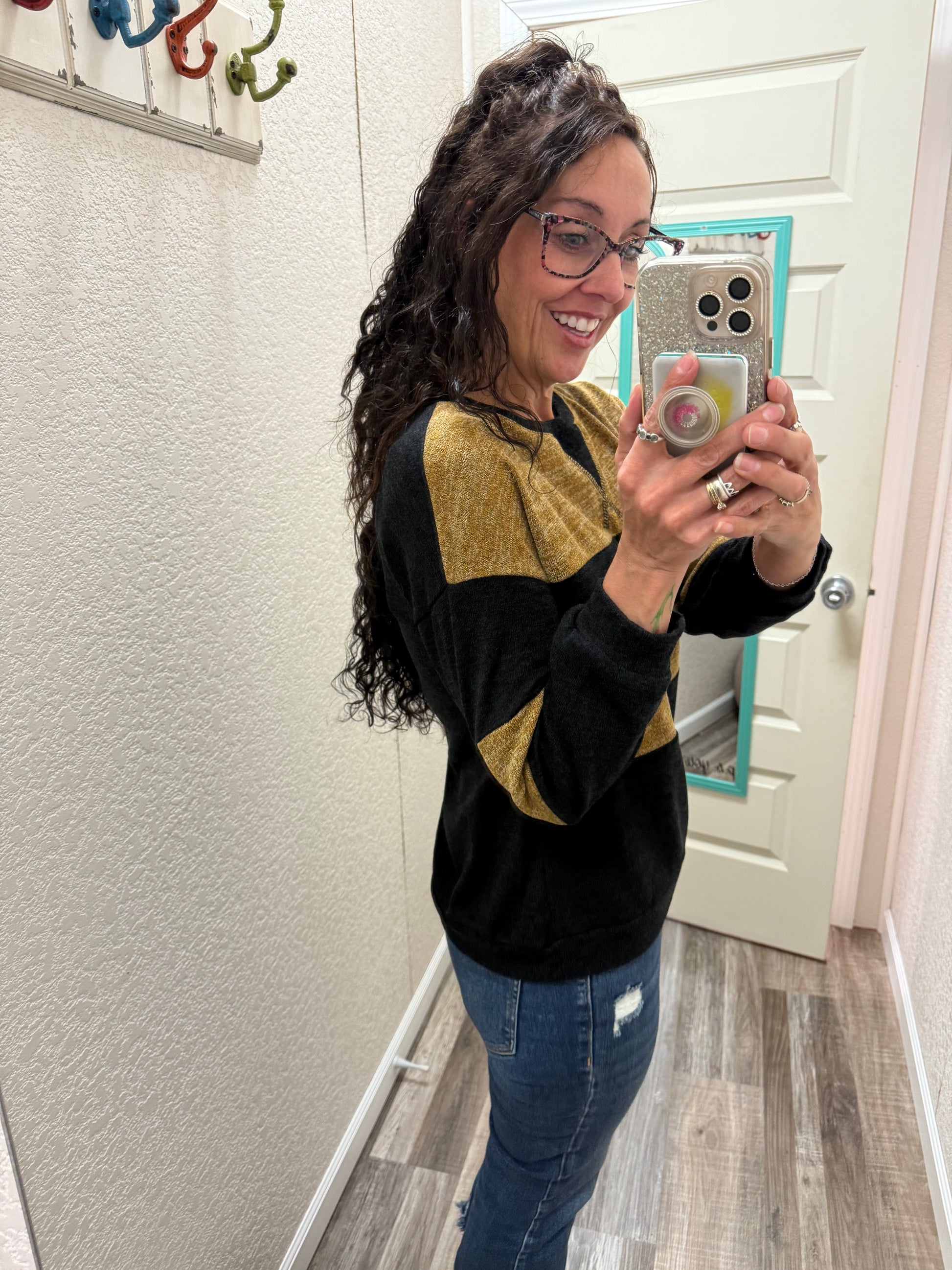 Two-Tone Solid Striped Contrast Casual Relaxed Fit Knit Top with Crewneck Stitching Neckline and Cuff Sleeves