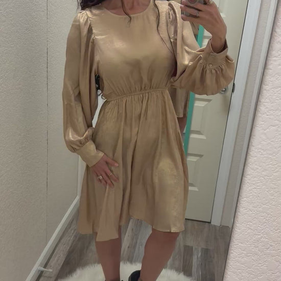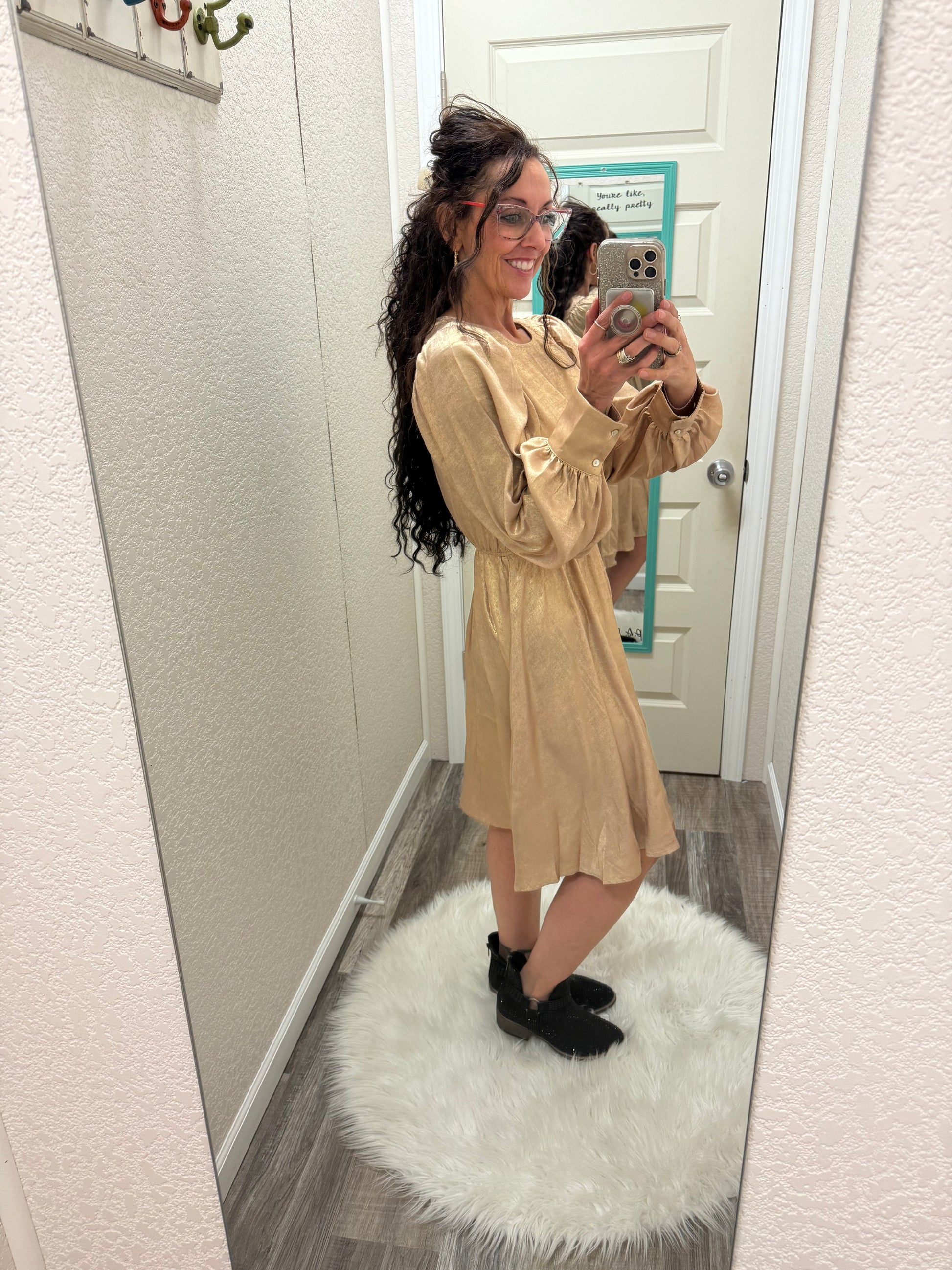 Expertly crafted for a flattering fit, the Evening Star Mini Dress features a boat neck, puff sleeves with elastic cuffs, and a comfortable elastic waist. The metallic foil fabric gives it a touch of glamour, while the back keyhole adds a chic detail. Perfect for any evening occasion.