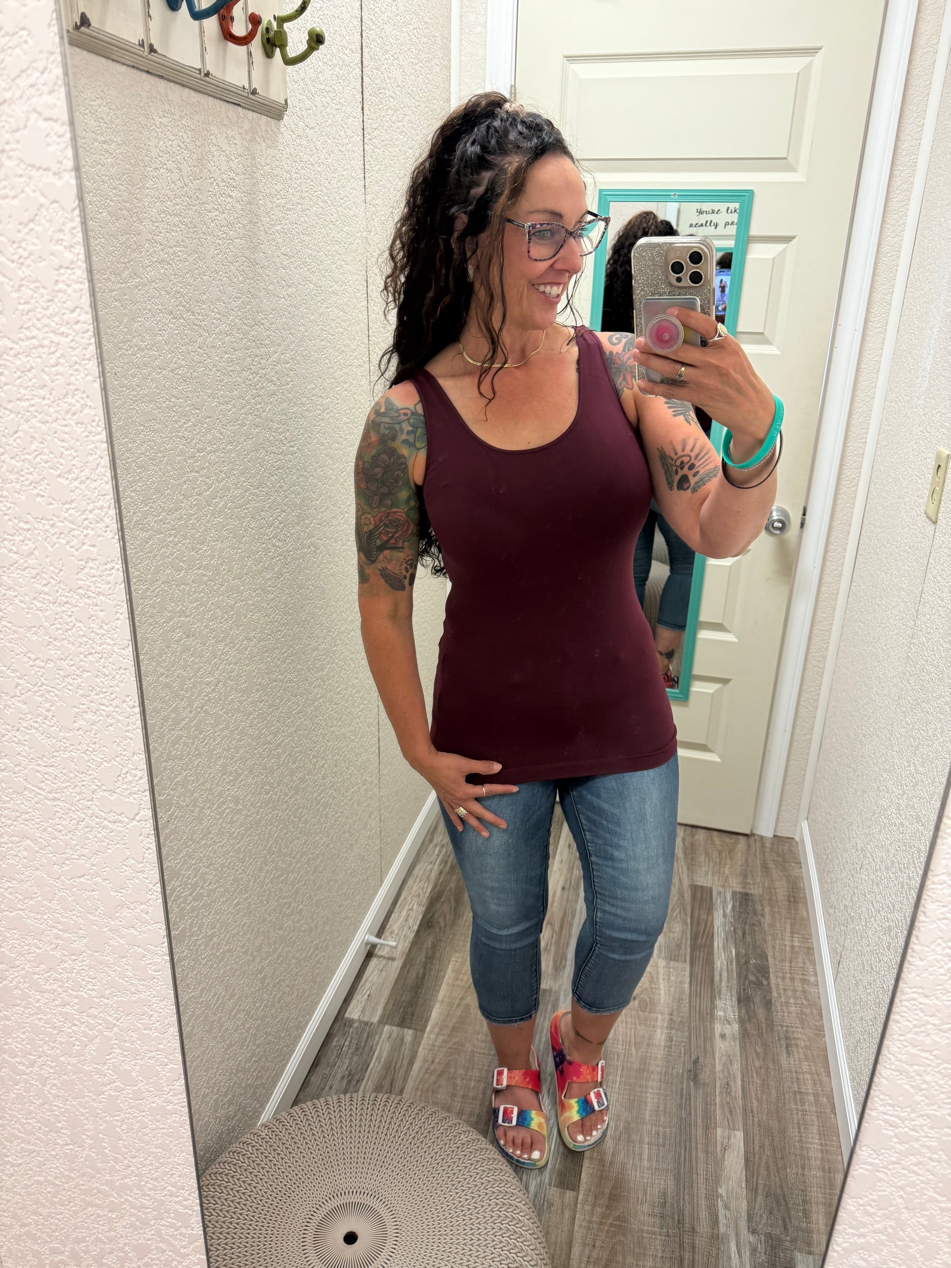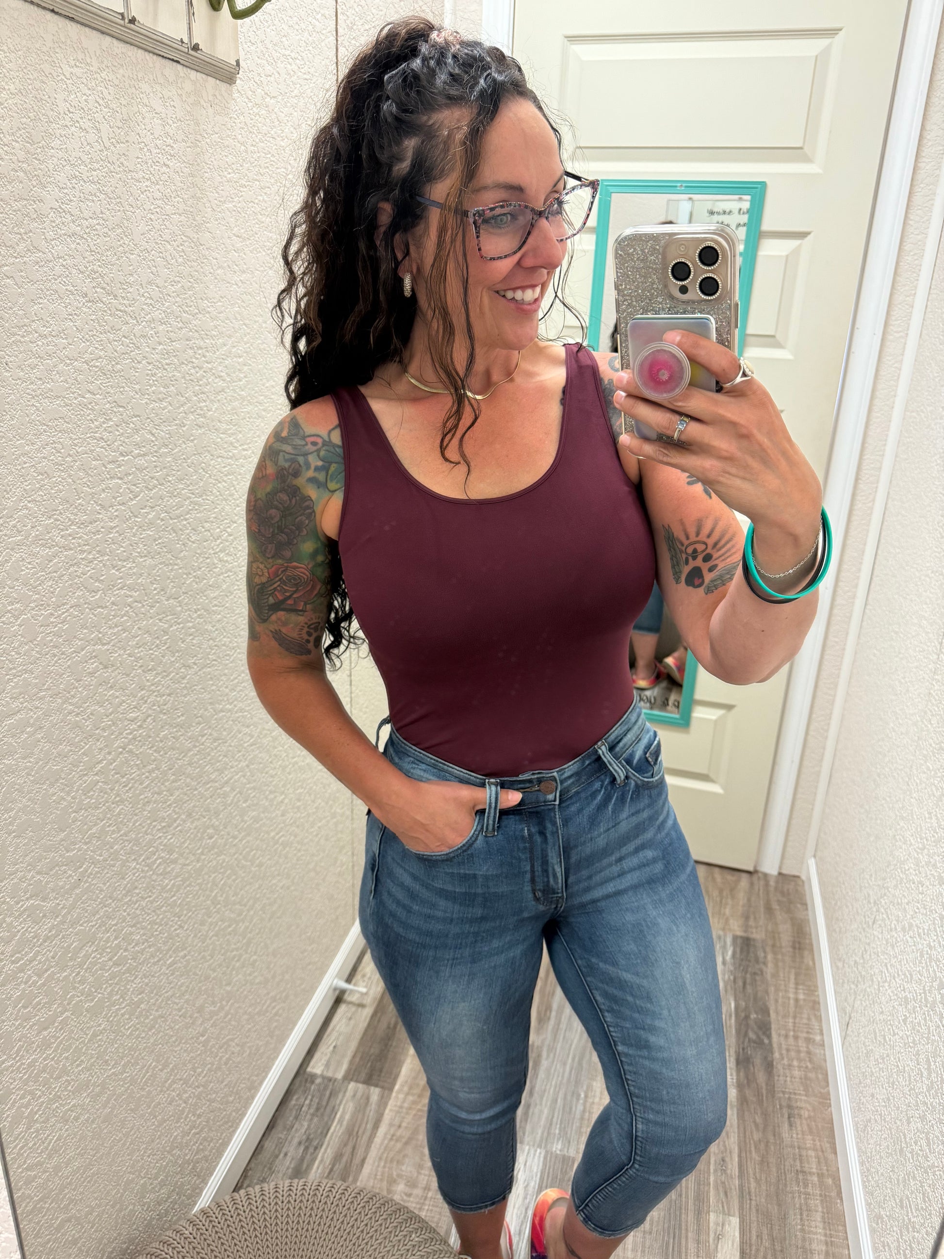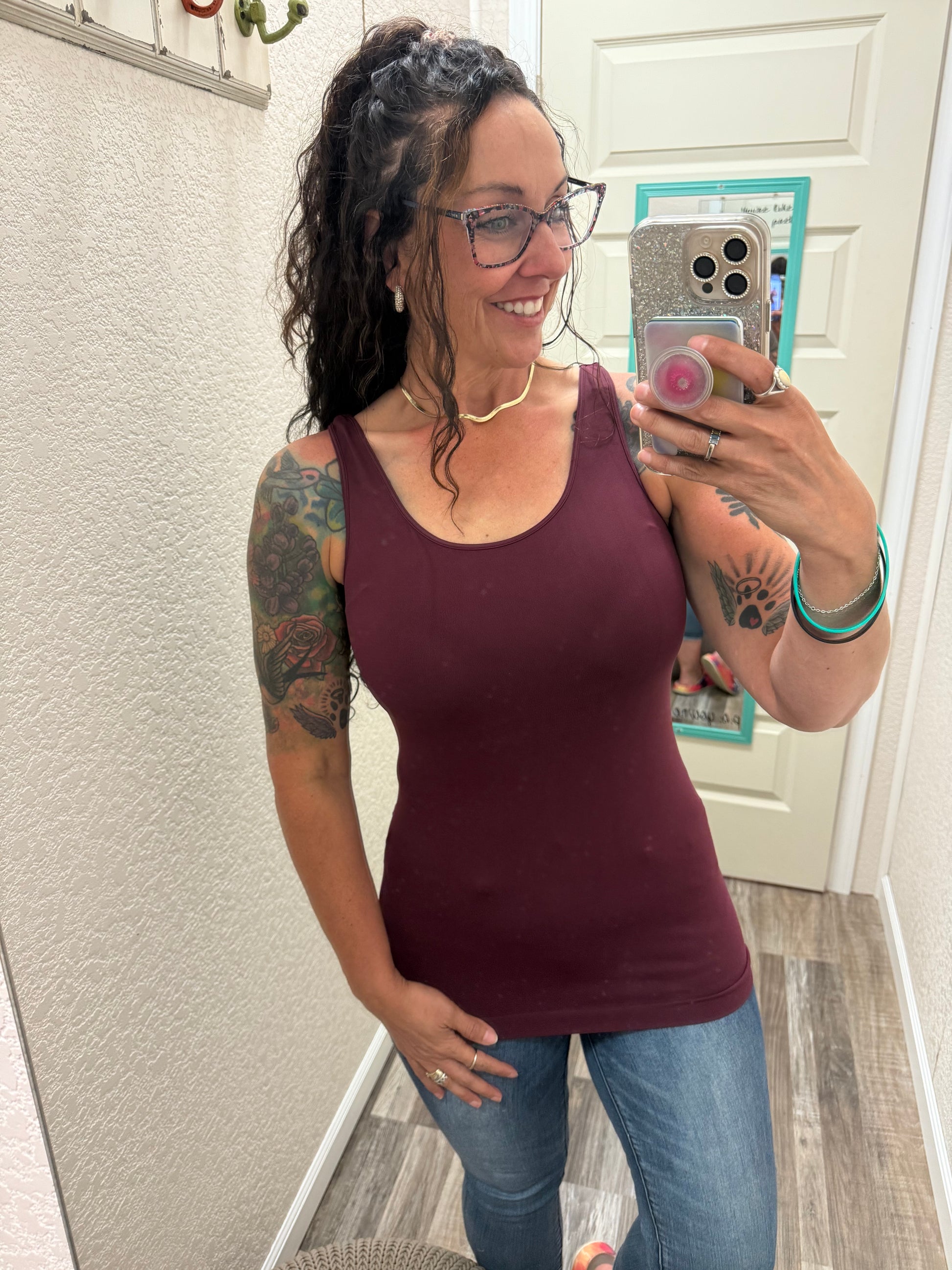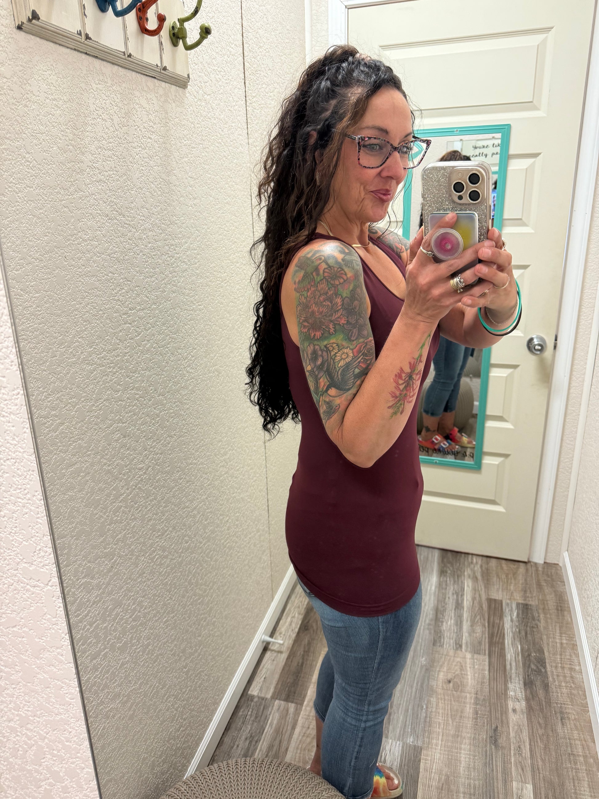 Wears: a Medium top and 7 in most jeans