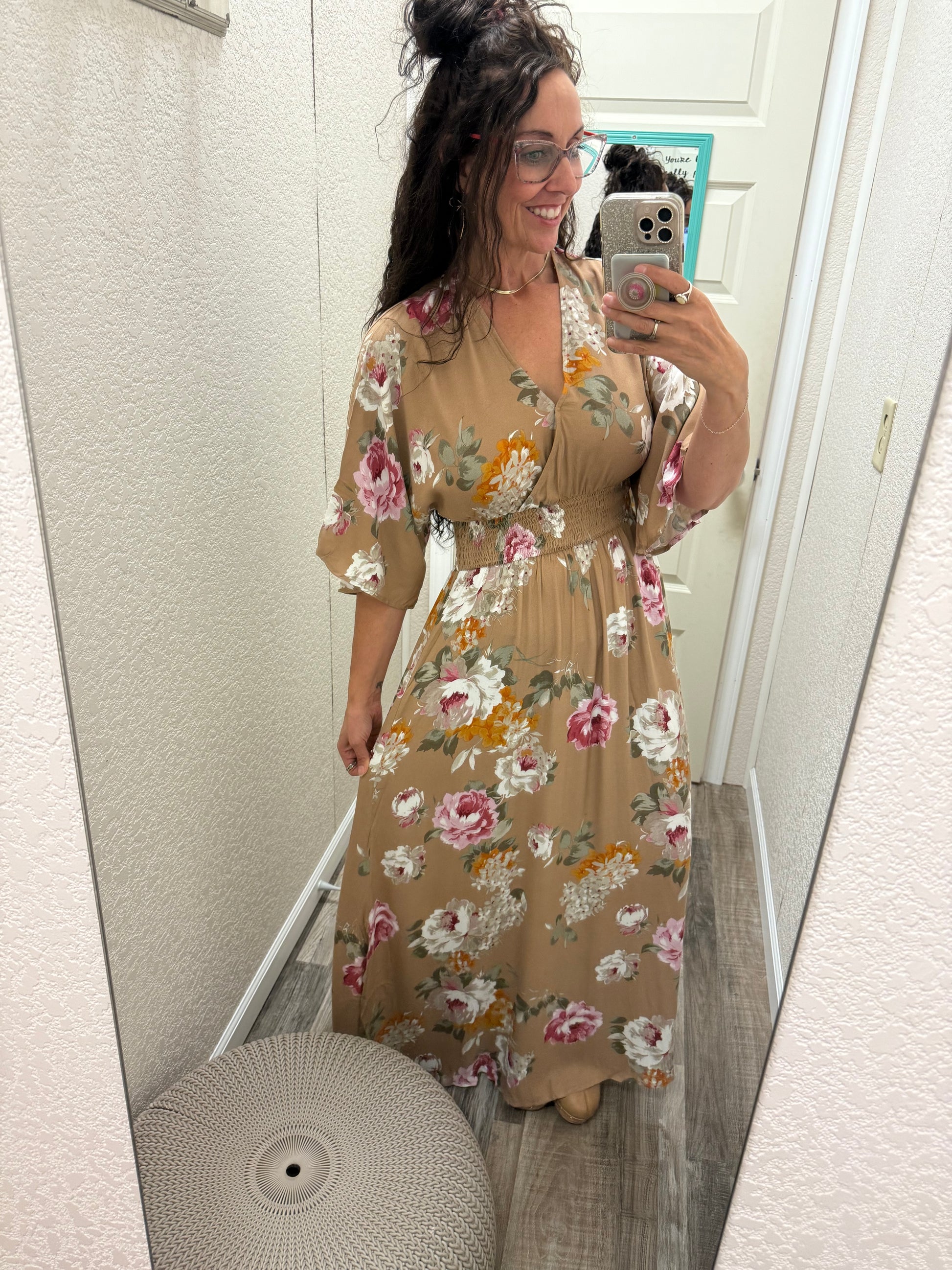 This Gardens of Fall Dress features a stunning floral print and a smocked waist for a flattering fit. With three-quarter length kimono sleeves and an open back with tie closure, this maxi dress offers versatility and style. Side slits add a touch of sophistication to this elegant piece.