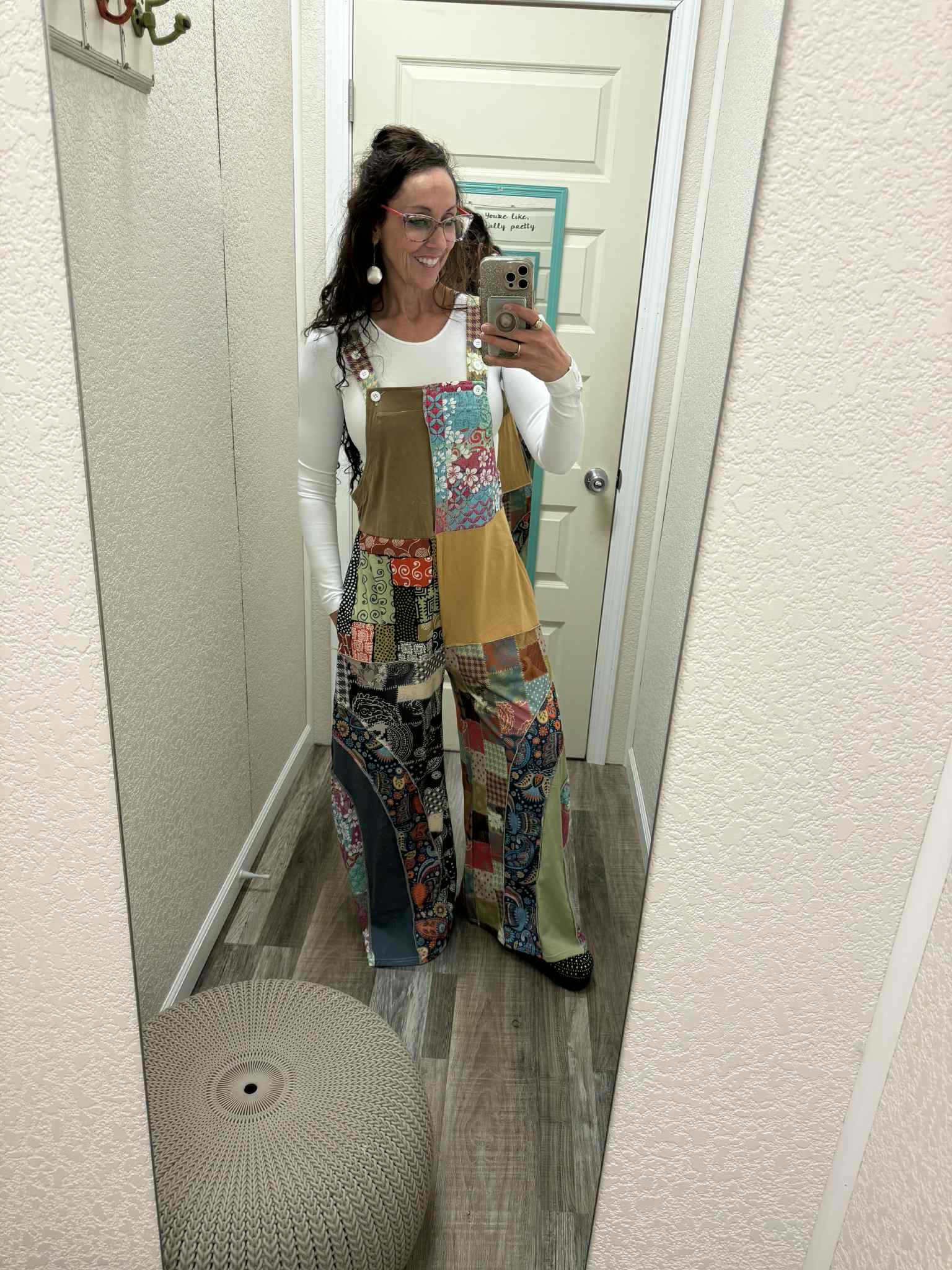Embrace effortless style with these Groovy Boho Floral Patchwork Overalls, designed for year-round wear. Featuring vibrant floral and whimsical print patches in a striking colorblock design, each pair showcases exposed stitching for authentic boho character. The relaxed, stretchy fabric moves with you, while adjustable buttoned straps and elastic back panels ensure a customized fit. Wide-leg silhouette with full-length cut, practical side pockets, and a straight neckline create an undeniably comfortable everyday look. Whether you're heading to a festival or embracing casual weekend style, these versatile overalls deliver that free-spirited aesthetic with functional comfort.