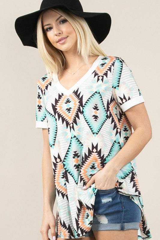 Introducing the Katie VNeck Top, the perfect combination of style and comfort. Made from lightweight rayon fabric, this Aztec print short sleeve top features a flattering V neck design. Stay trendy and comfortable with this must-have addition to your wardrobe.