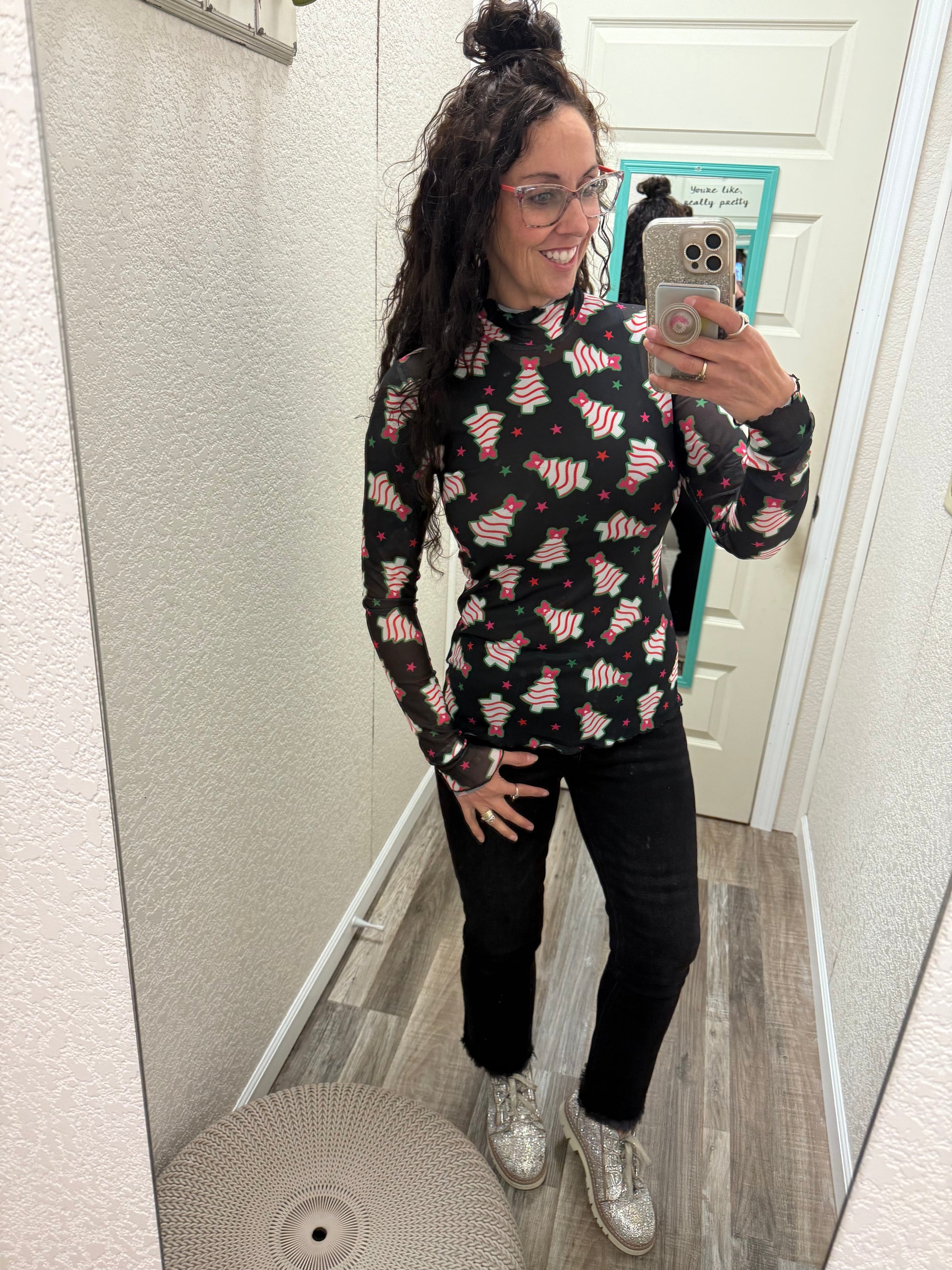 Get trendy with the Keigan Mesh Top- Bow Christmas Treats! This playful top features lettuce hems, a mock neckline, and a sheer mesh material that can be layered under or over any outfit. Don't miss out on this trendy addition to your holiday wardrobe!