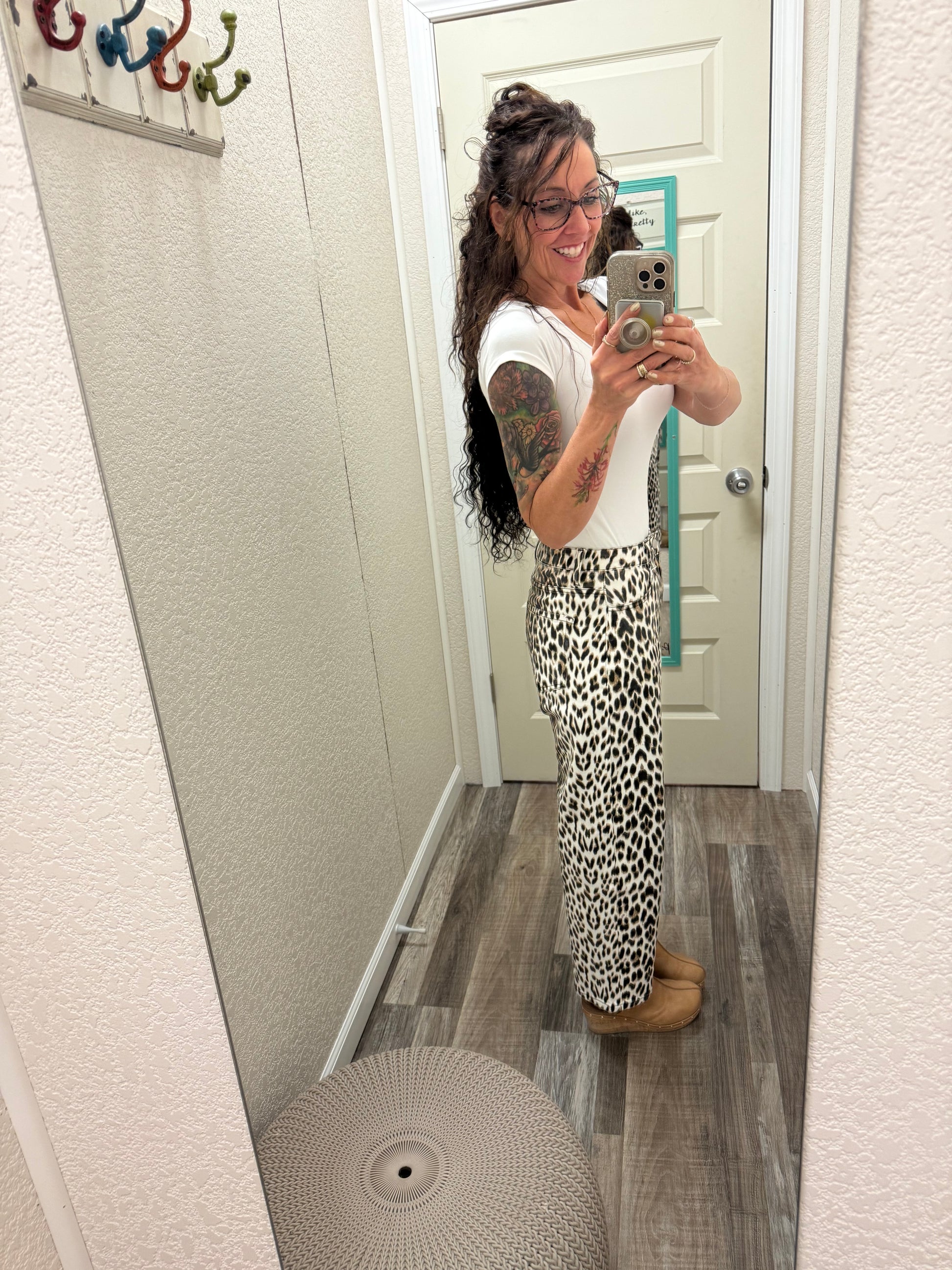 Leopard Barrel Leg Jeans These stretch denim jeans combine a bold leopard print with a contemporary barrel leg silhouette, creating a statement piece that transitions effortlessly from casual to elevated styling. The cropped length hits at the ankle, offering a modern proportion that flatters various frame types. Crafted with stretch fabric, these jeans provide comfortable movement throughout your day while maintaining their shape. The distinctive print adds visual interest to any outfit, making them a versatile foundation for building multiple looks with minimal effort.