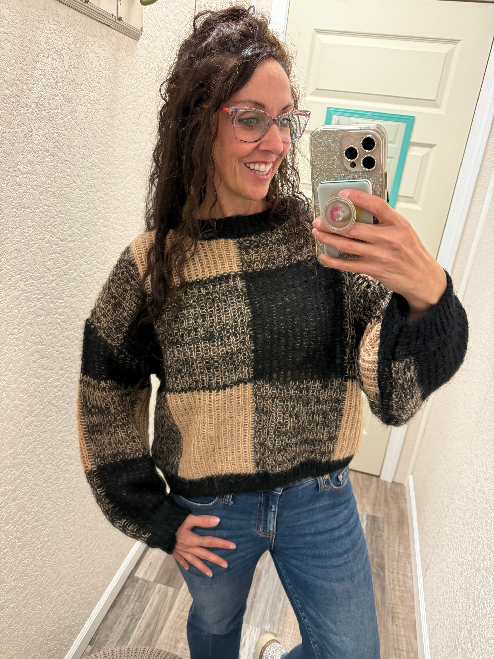 "The Lillian Plaid Sweater features a round crew neck and a classic plaid pattern, giving it a timeless and versatile look. The long sleeves and drop shoulder provide a comfortable and relaxed fit, while the contrast trim detail adds a touch of modernity. This pullover sweater is a must-have for any wardrobe."