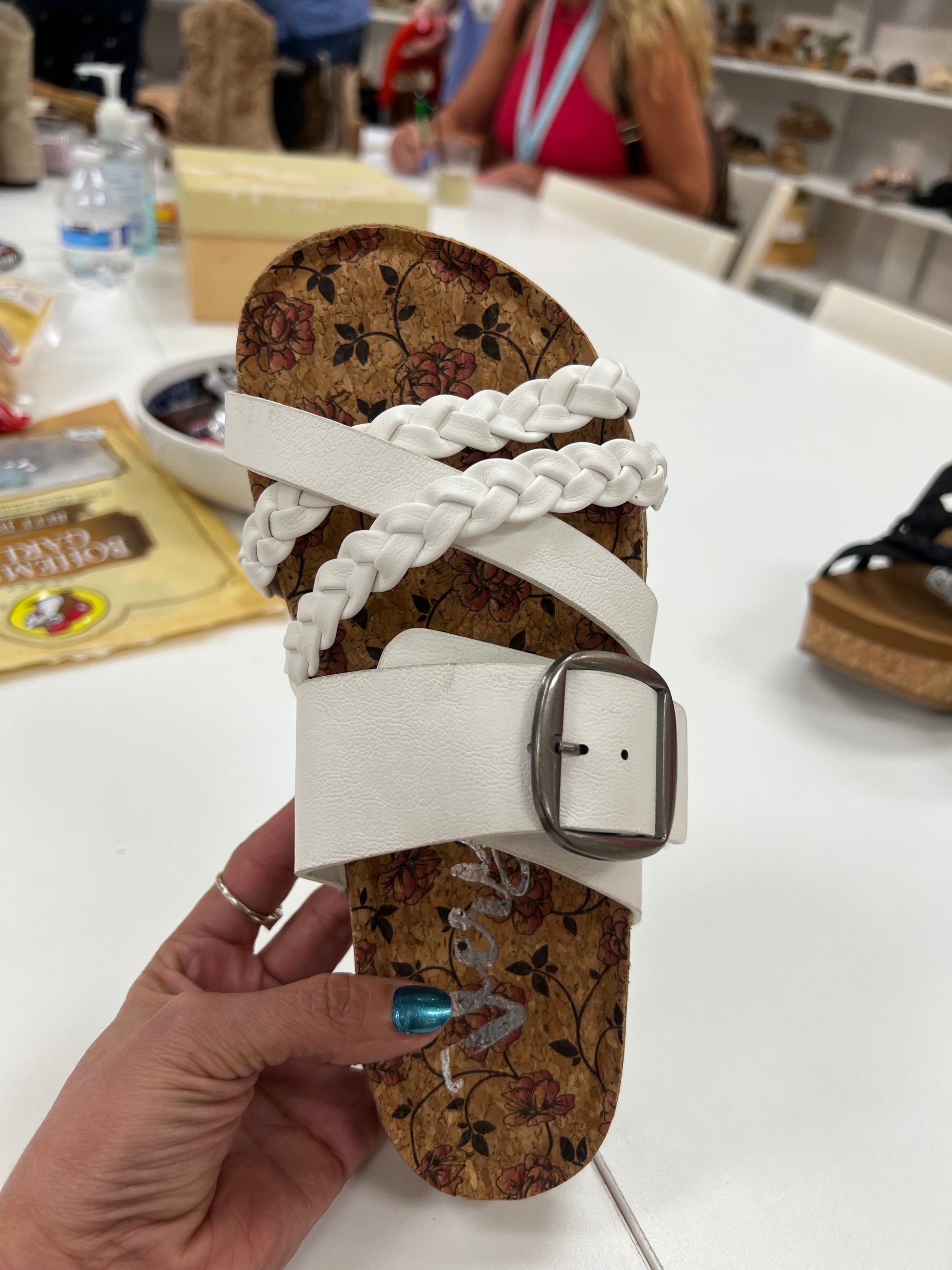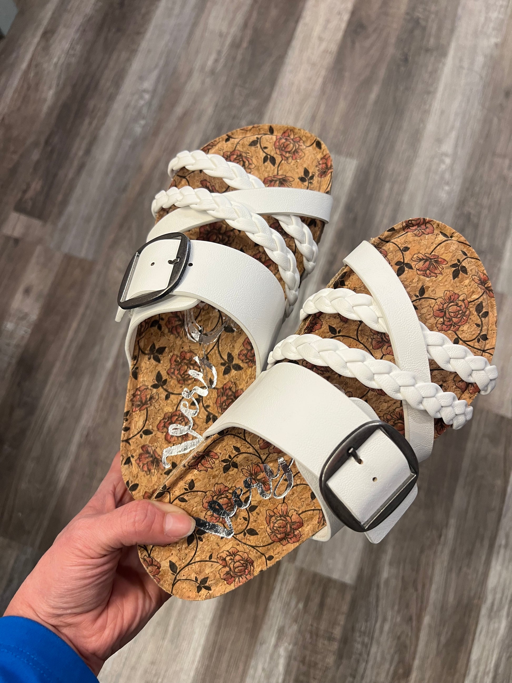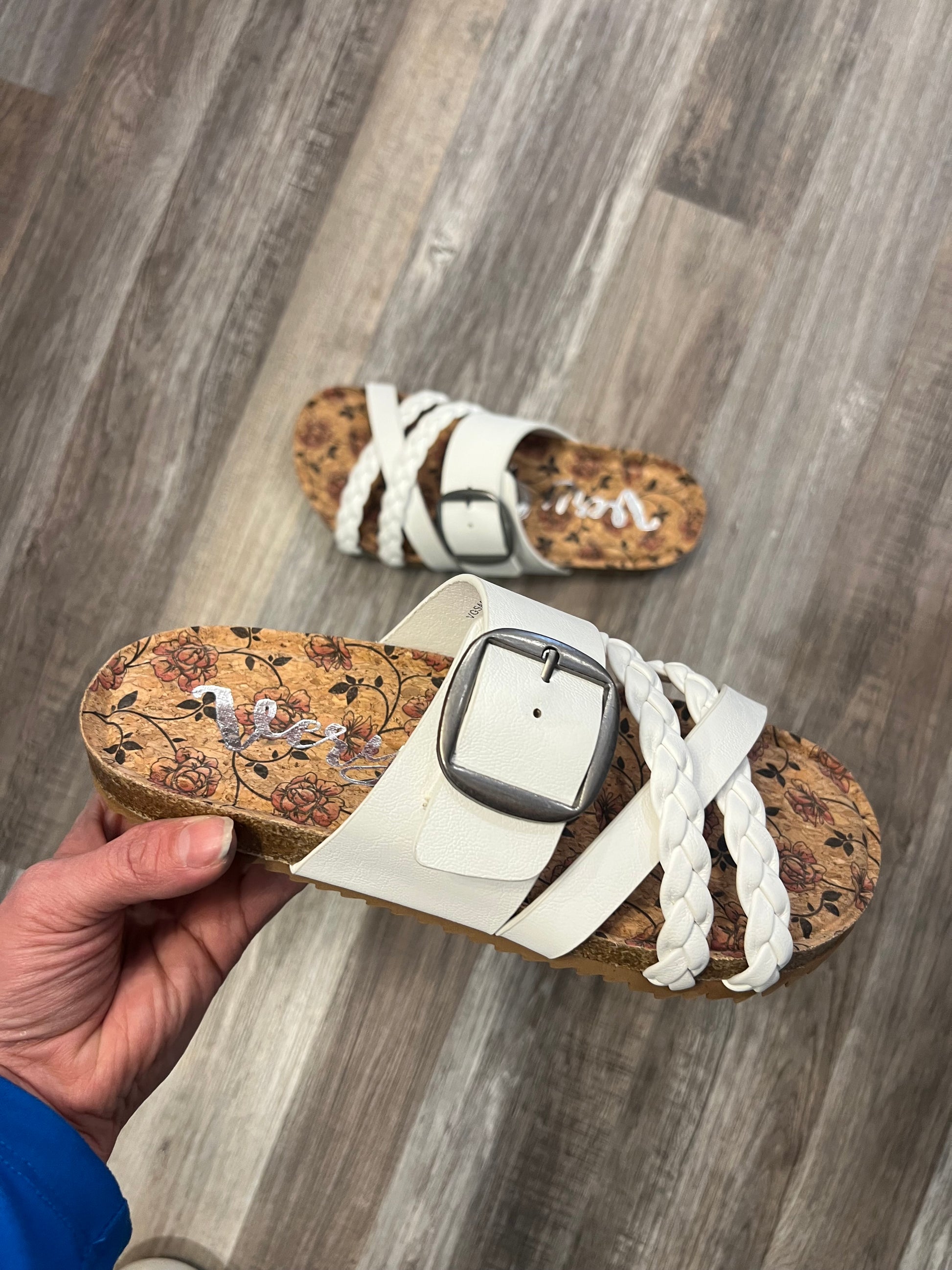 Expertly crafted by Very G, the Nora White Sandals exude elegance and comfort. Featuring an adjustable brushed nickel buckle and braided straps, these sandals provide a secure and stylish fit. The cushioned floral sole adds a touch of femininity to your step. Elevate your summer style with these must-have sandals.