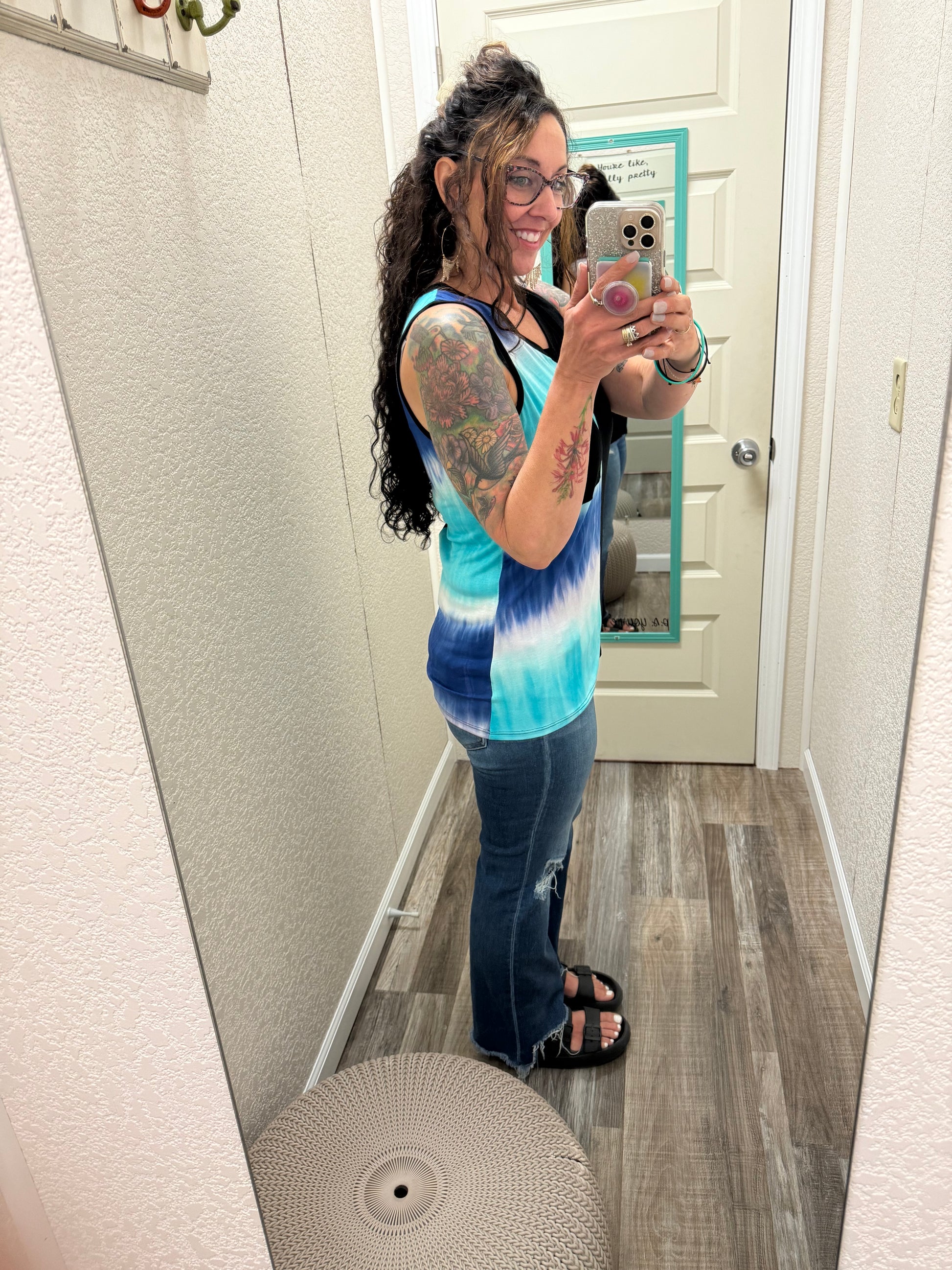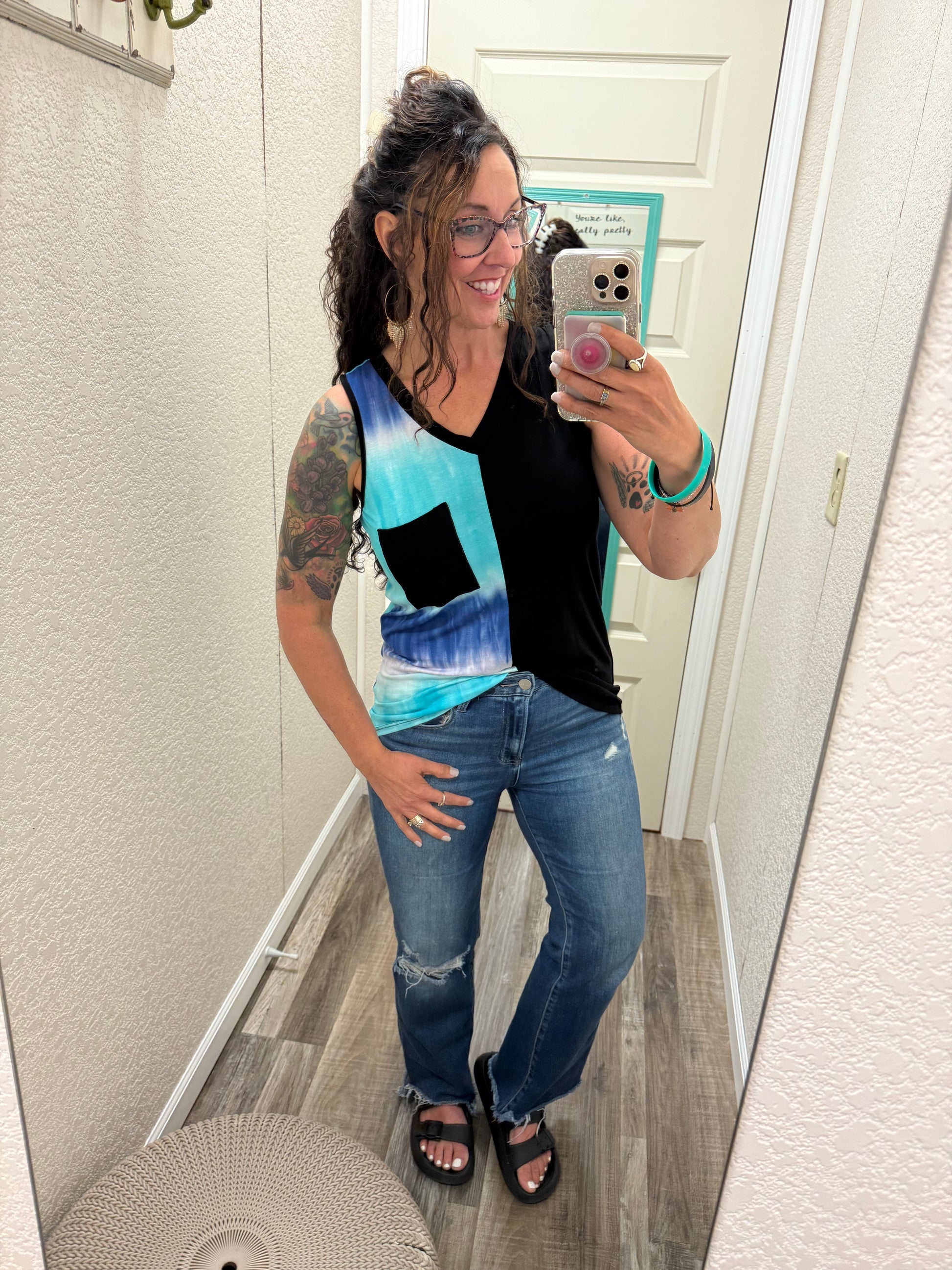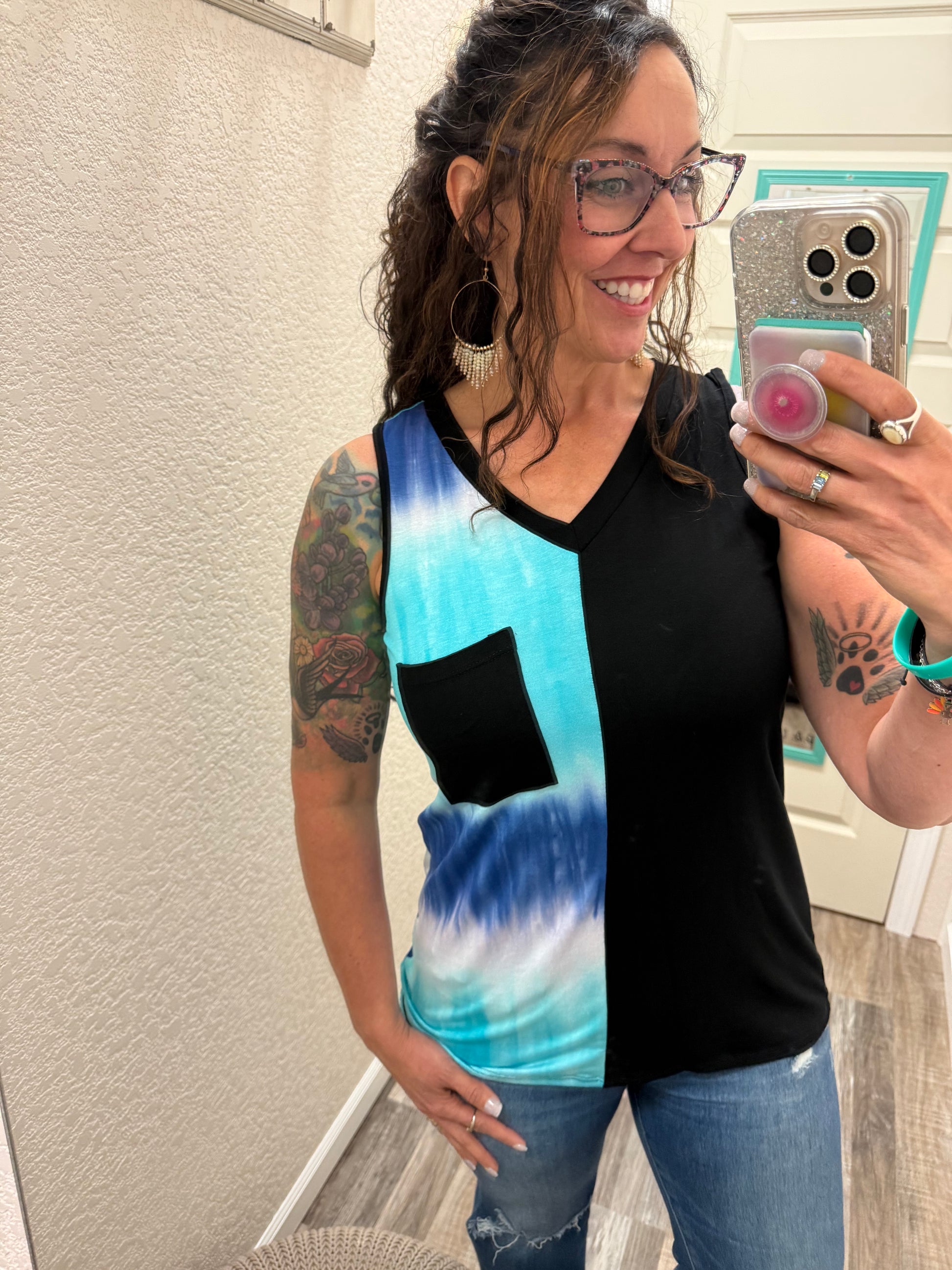 This Ocean Breeze Color Block Tank Top features a relaxed fit and a stylish color block design. The V neck and front pocket add to its fashionable look. Comfortable and trendy, this tank top is perfect for a day at the beach or a casual outing.