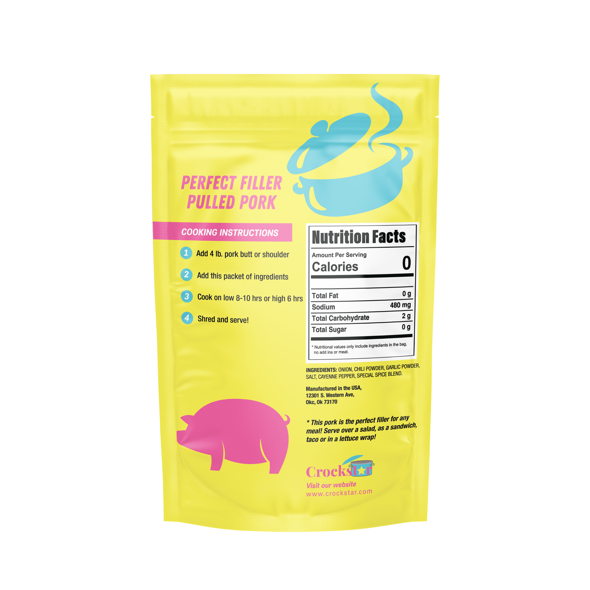 Crockstar's Perfect Filler Pulled Pork provides a delicious tender flavorful pork that is perfect served as a sandwich, in a tortilla or even topped on nachos!