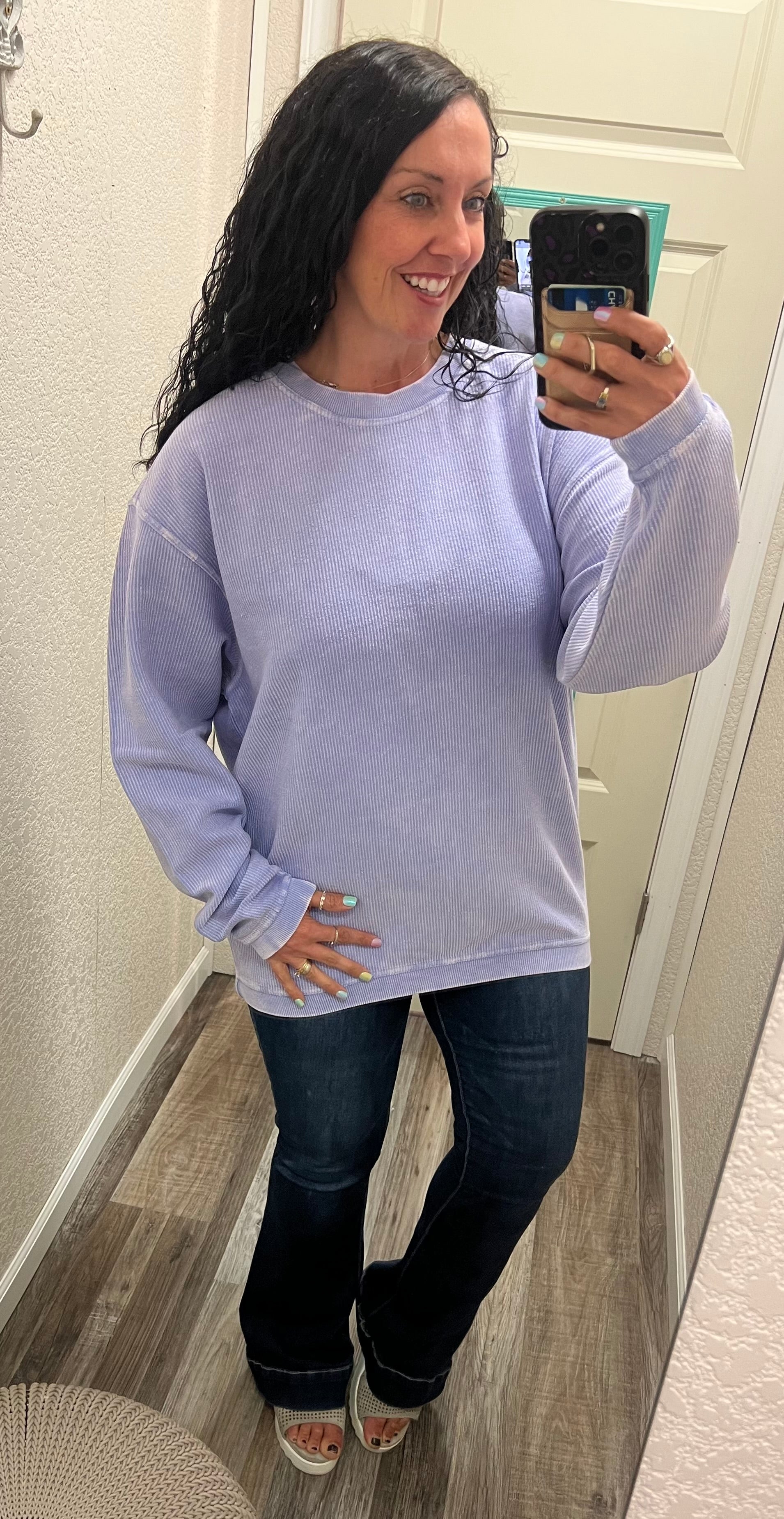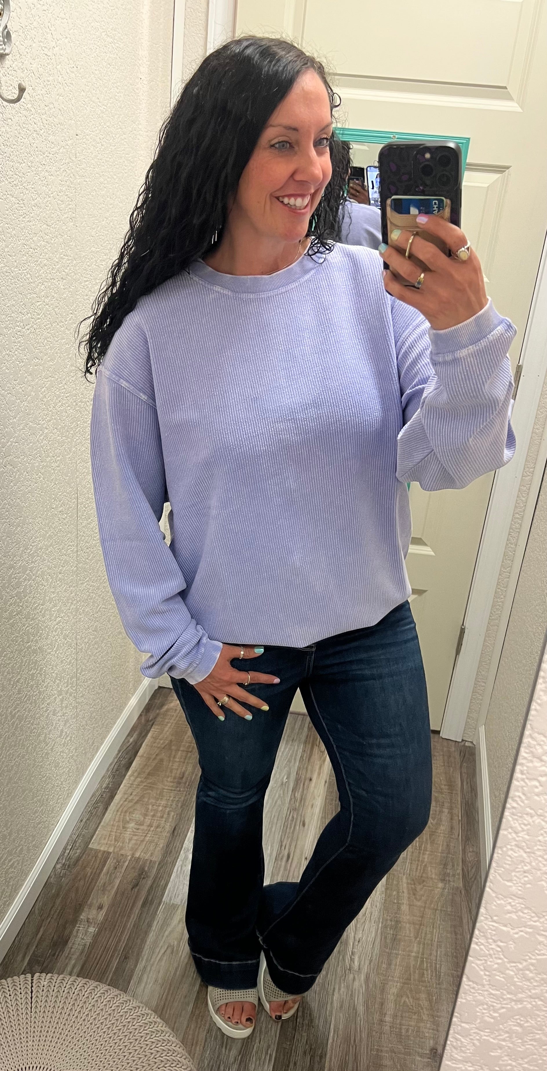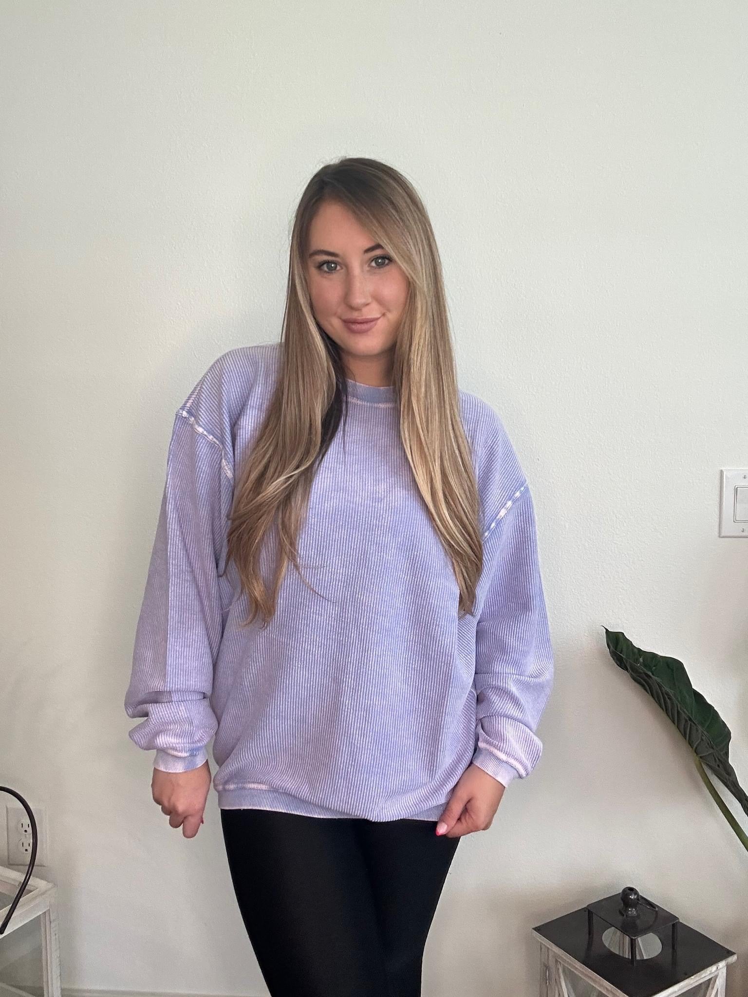 The Periwinkle Luxe Corded Crew is made of pre-shrunk cotton, ensuring a perfect fit. Its oversized design provides comfort and style. Careful, getting one will make you want more!