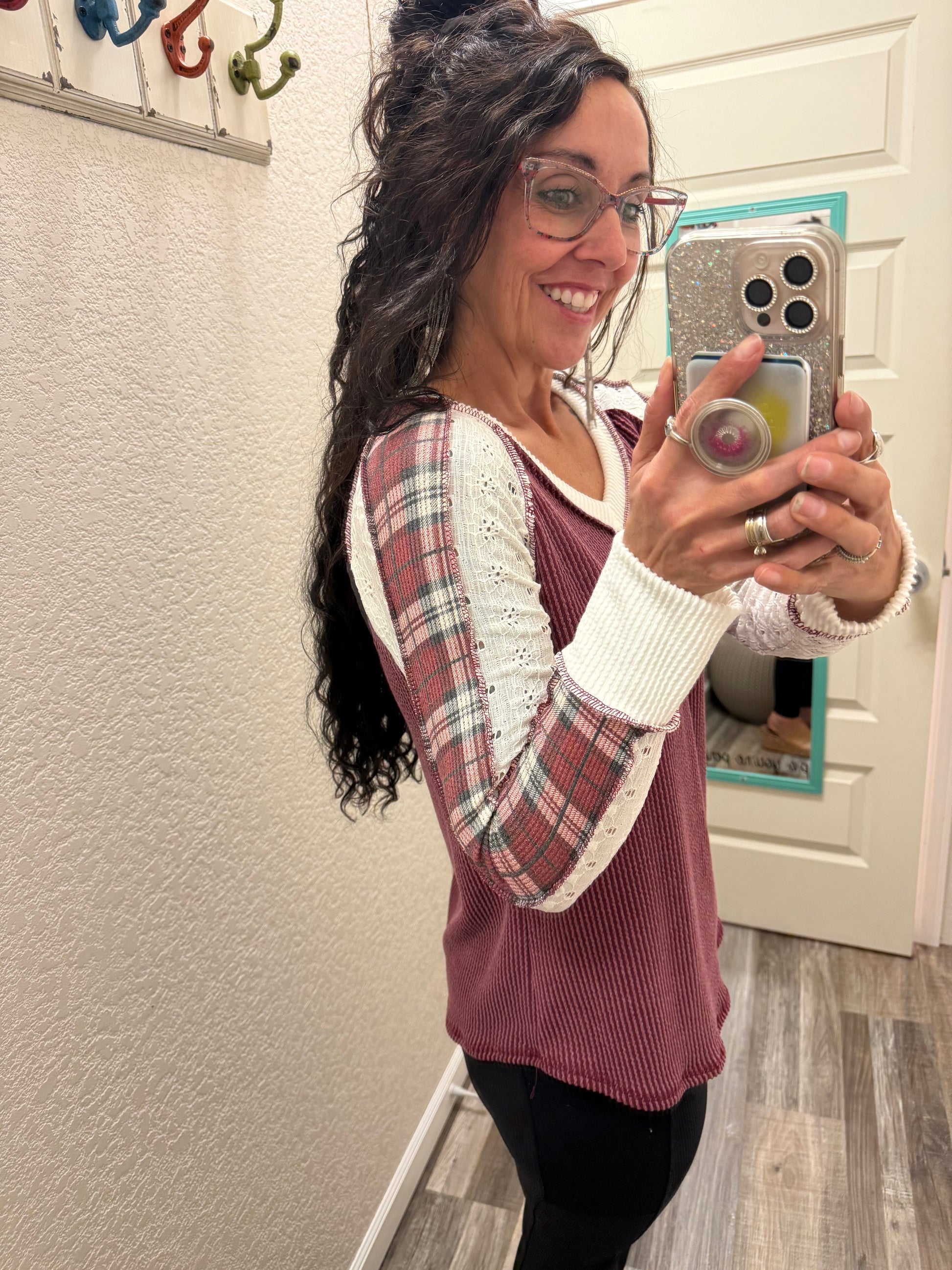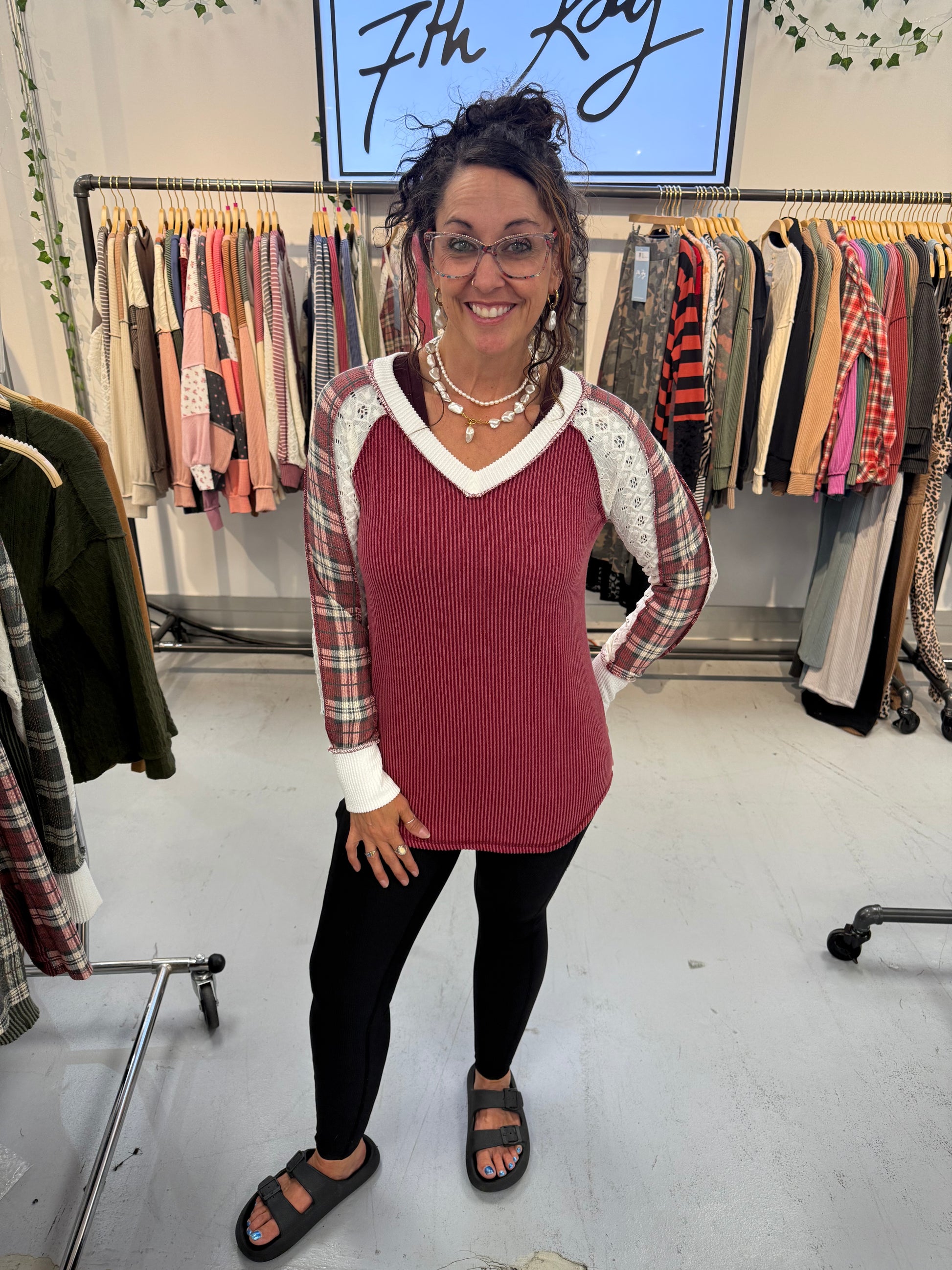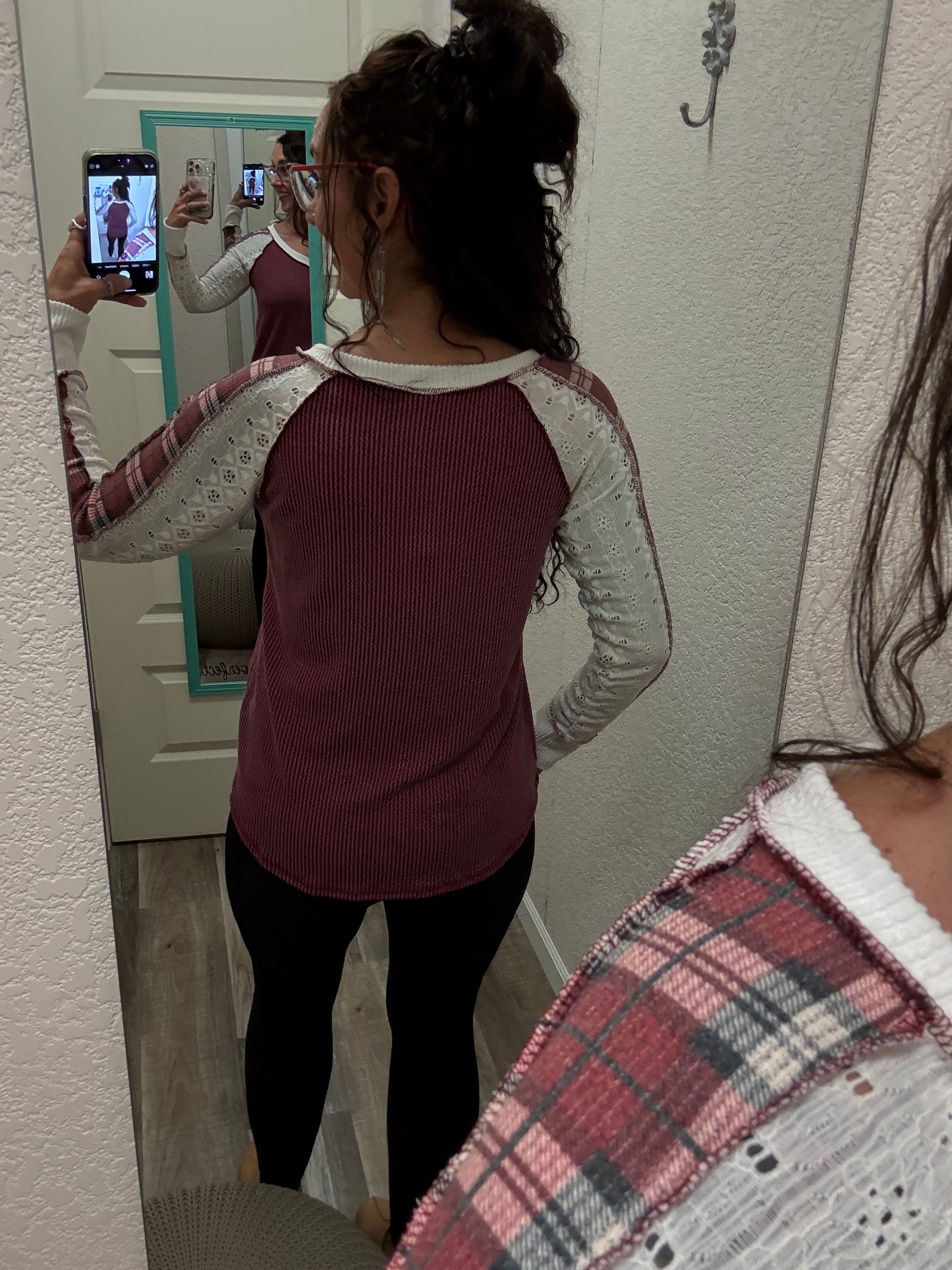 Lia Burgundy PLAID CONTRAST V Lace NECK LONG SLEEVE TOP