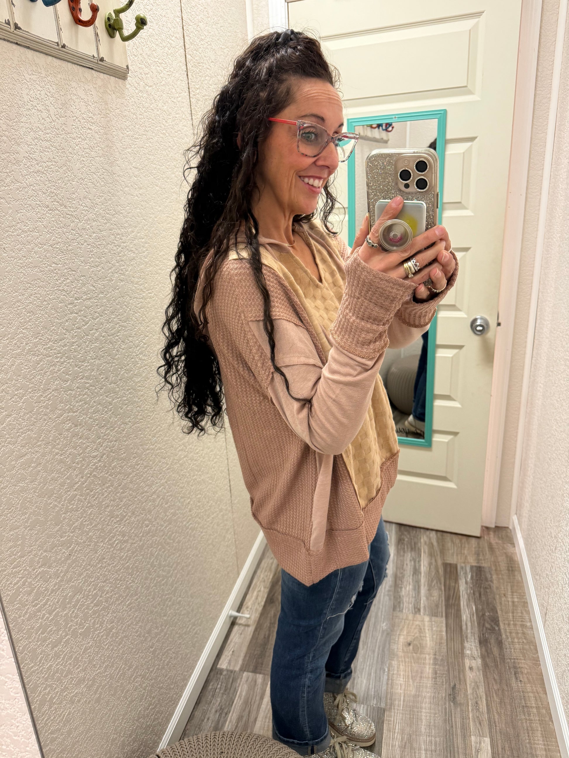Wears: a Medium top and 7 in most jeans