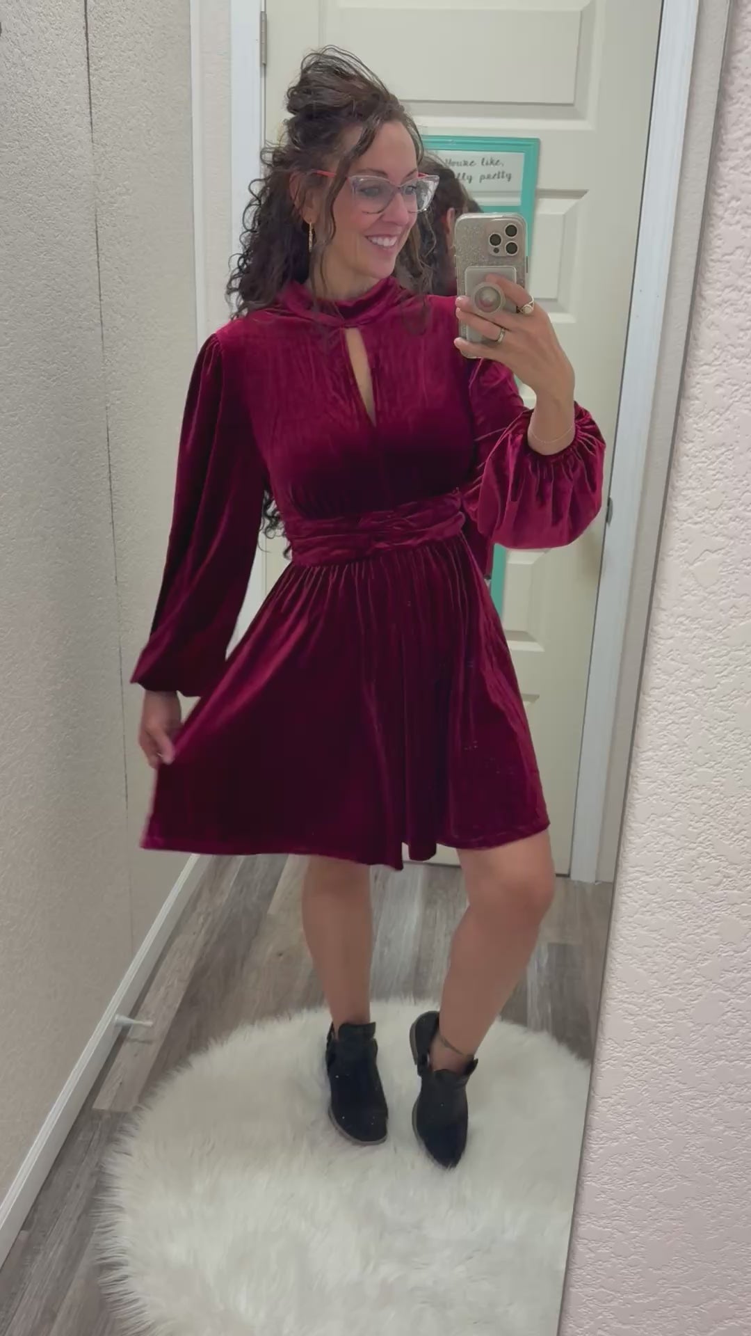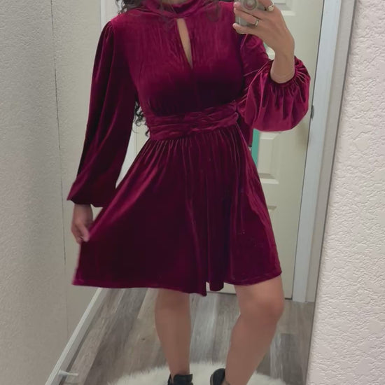 This Ruby Sue Velvet Dress is perfect for a romantic evening with its elegant and chic style. The front keyhole design adds a touch of allure, while the velvet material elevates the look. With its puff sleeves, this mini dress is both stylish and comfortable. Make a statement with this romantic dress.