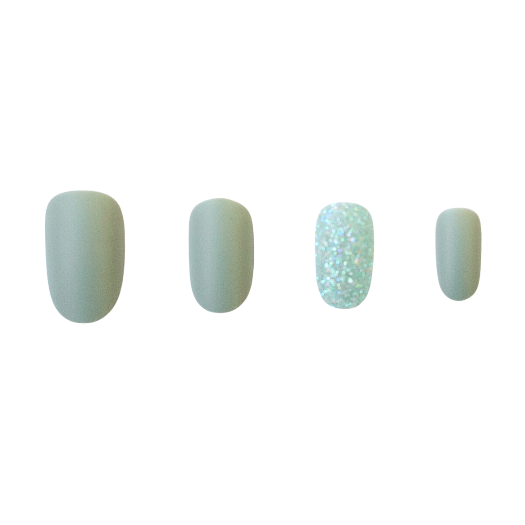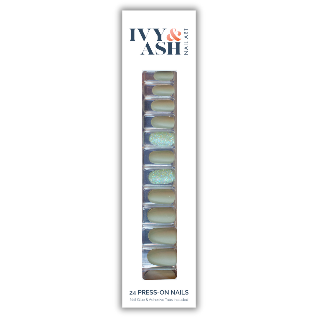 Sage Shimmer COLOR/DESIGN: Light sage green with glitter accent nails SIZE & SHAPE: Medium Round FINISH: Glossy & Glitter EACH SET INCLUDES: -24 reusable artificial press-on nails -nail glue (2g) -24 adhesive tabs -mini nail file -wooden cuticle stick -alch*l prep pad ADDITIONAL DETAILS: -Sleek, modern packaging -Easy to follow application & removal instructions included on the packaging -