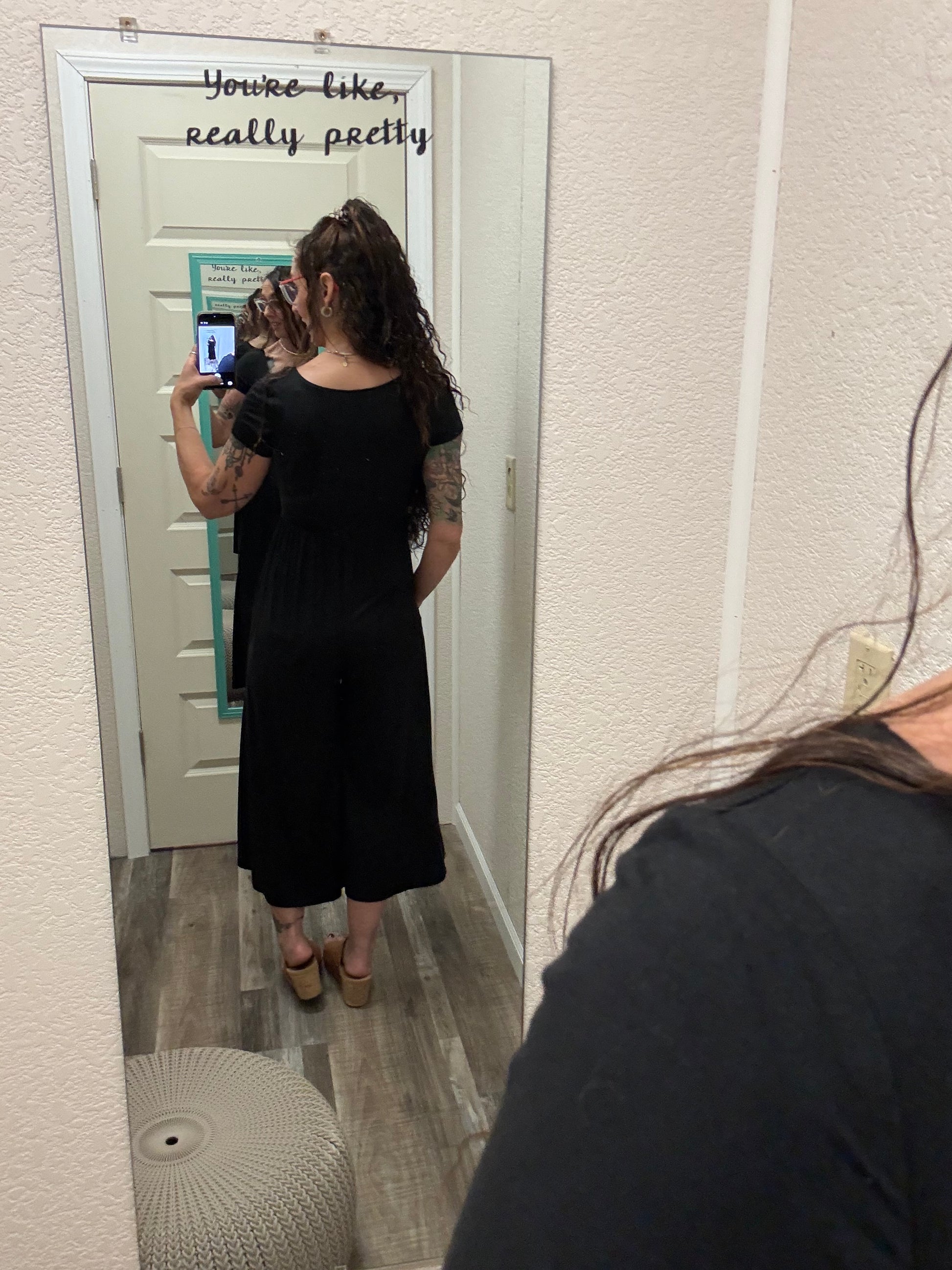 Wears: a Medium top and 7 in most jeans