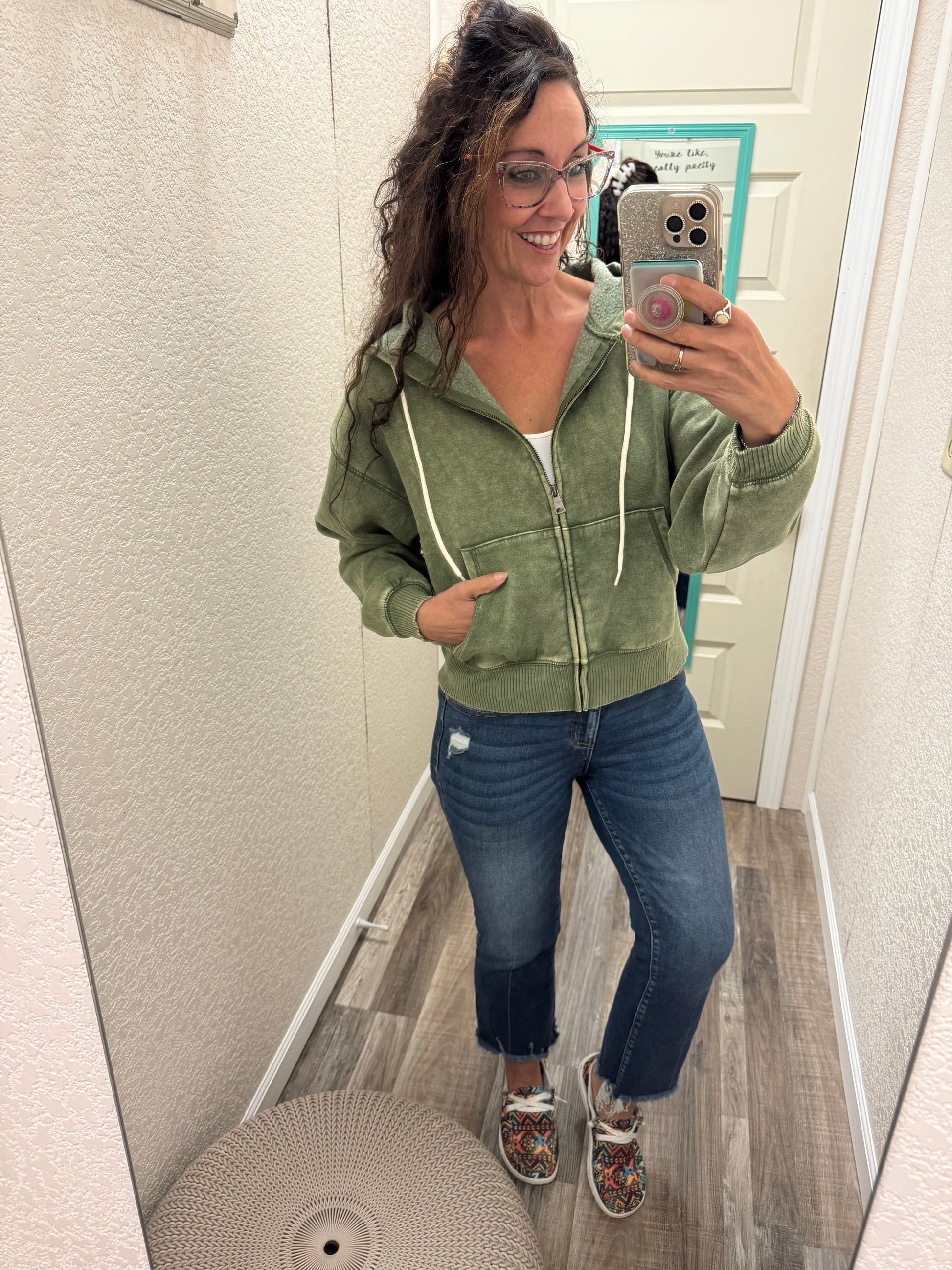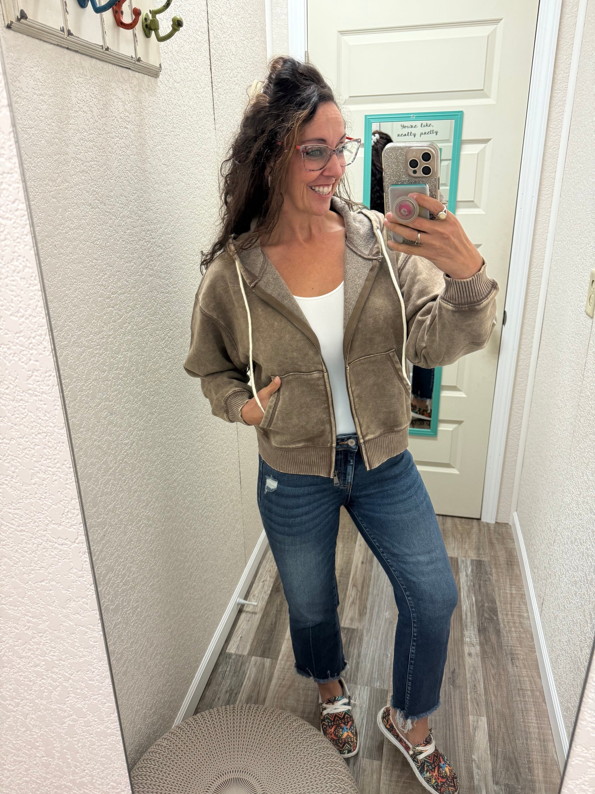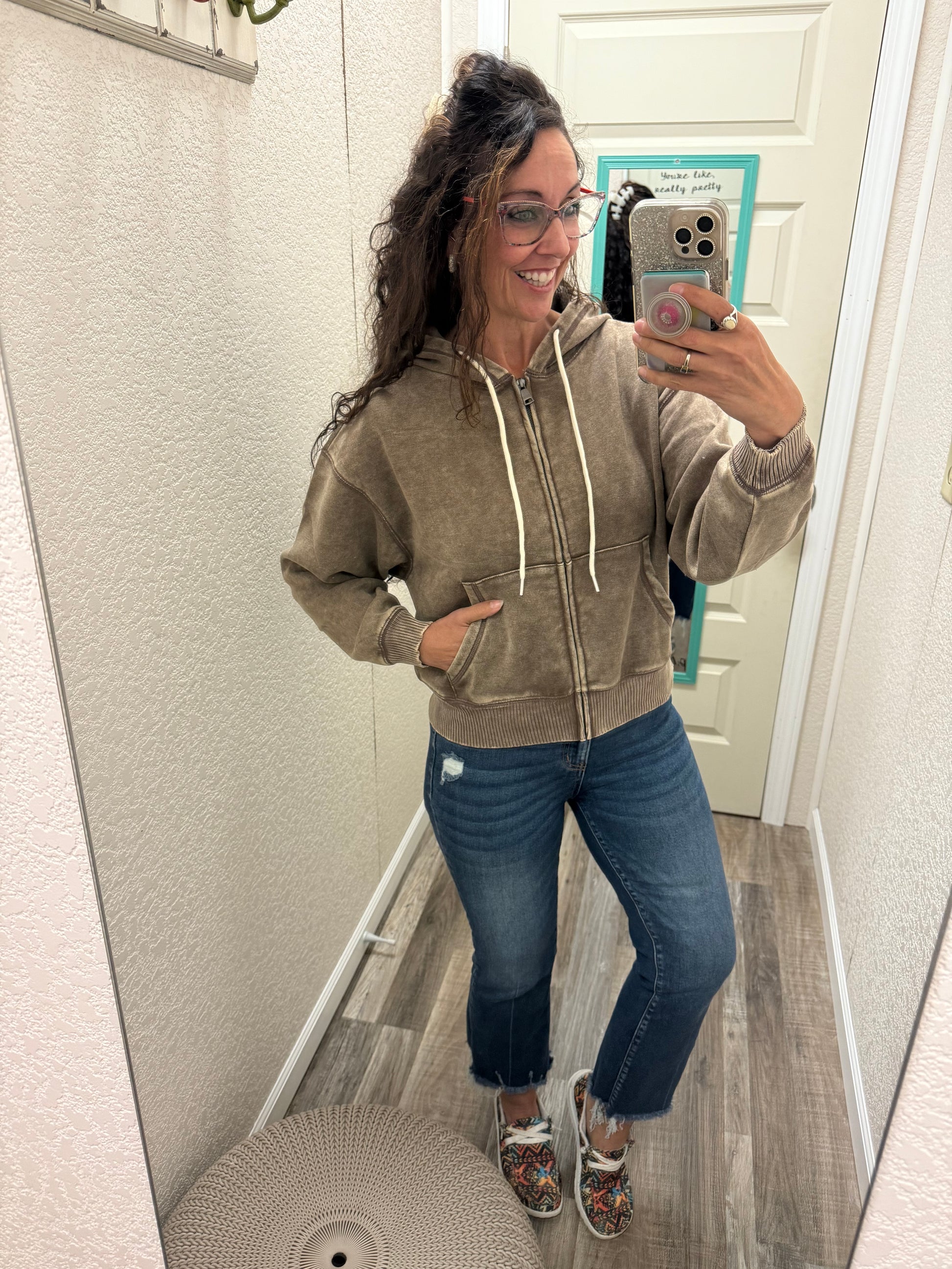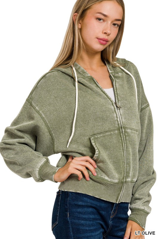 Introducing Larissa - the perfect addition to your wardrobe. Made from acid wash fleece, this cropped zip up hoodie features pockets for convenience and style.