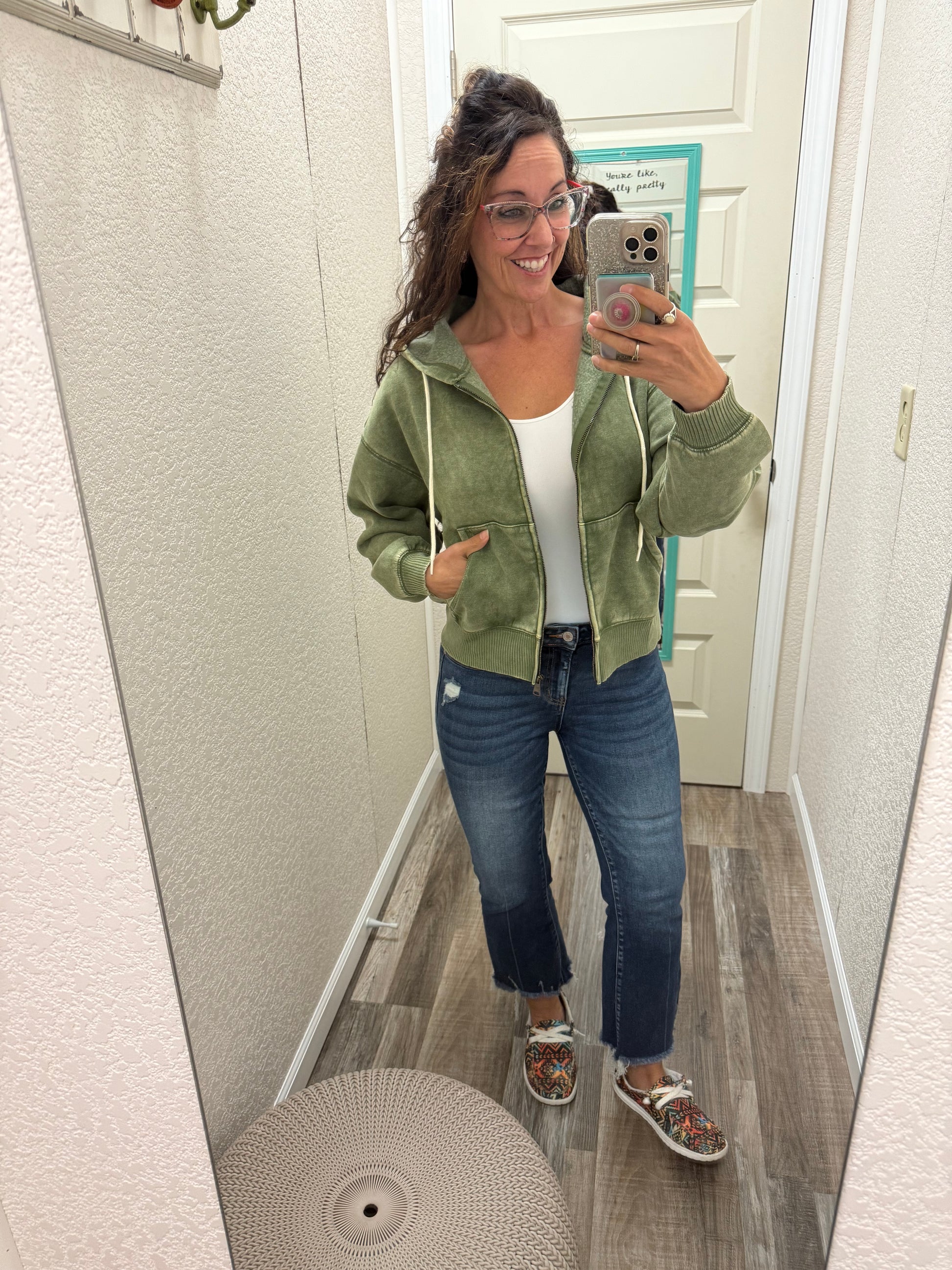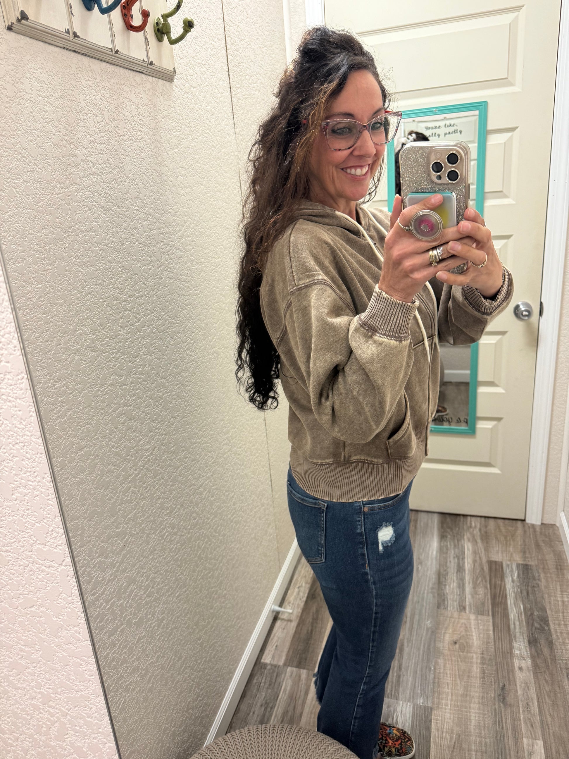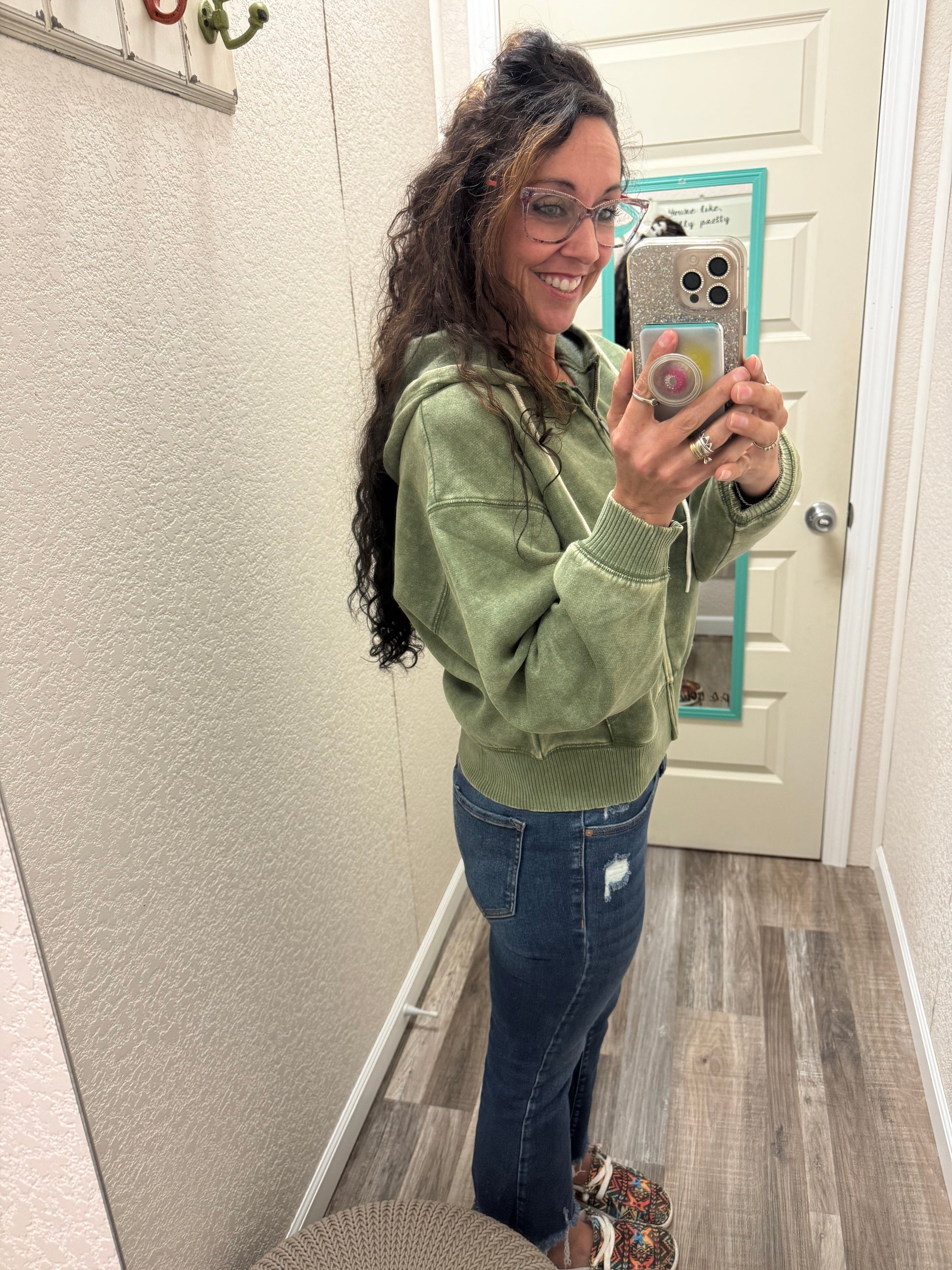 Introducing Larissa - the perfect addition to your wardrobe. Made from acid wash fleece, this cropped zip up hoodie features pockets for convenience and style.