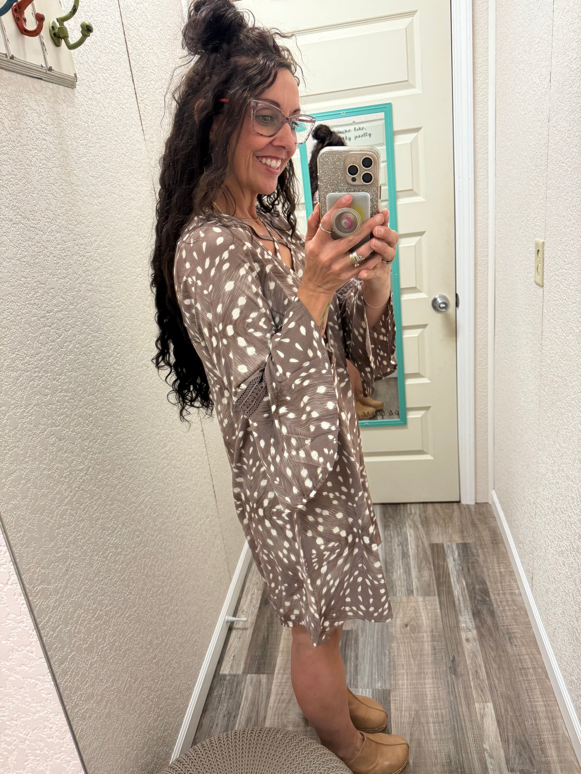This stylish shift dress features a unique geo print and delicate crochet trim on the three-quarter length sleeves. The crisscross spaghetti strap neck details add a fashionable touch to the design. The perfect choice for transitioning between seasons, this dress offers versatile style and comfort.