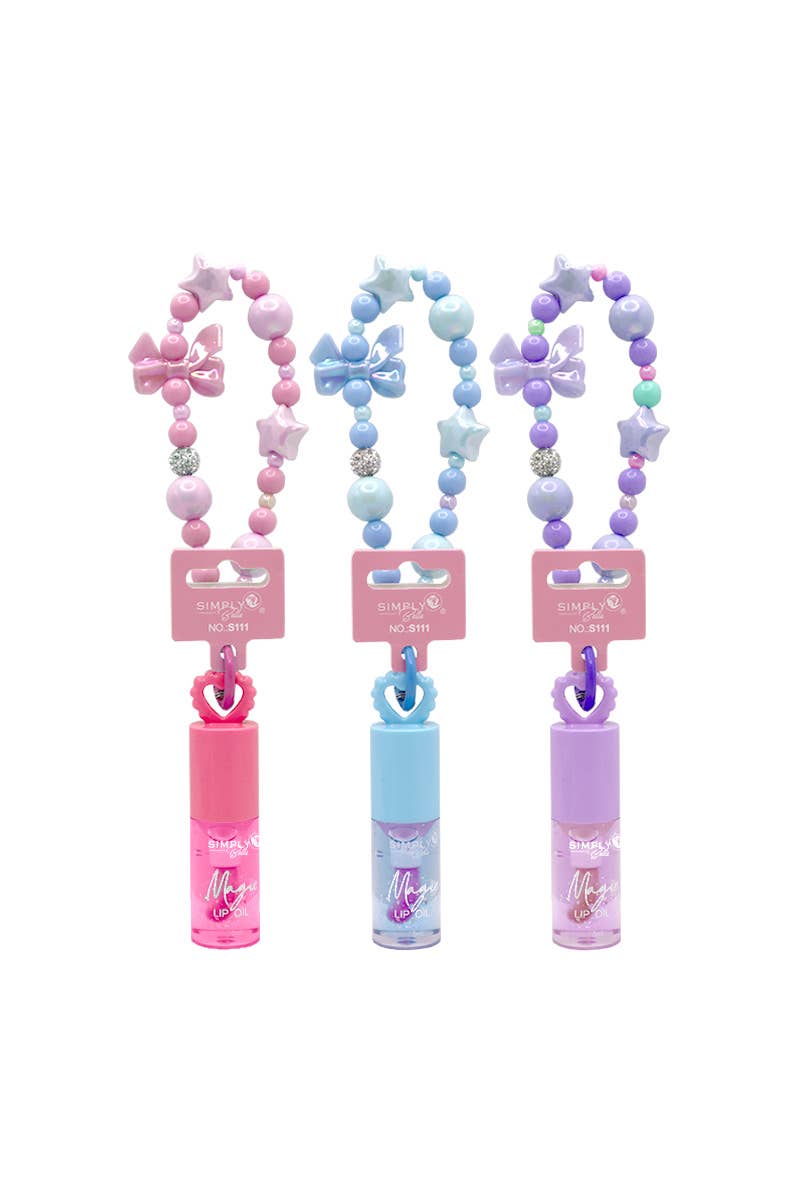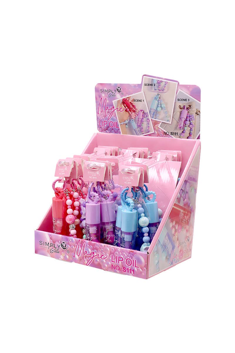 Magic Lip Oil & Bead Charms. A lightweight, non-sticky formula that reacts to skin's natural pH level to create a unique tint tailored to individual chemistry. As it glides on smoothly, this nourishing oil not only adds a subtle, custom flush of color to lips but also keeps them feeling soft, hydrated, and glossy throughout the day. Adding a fun and fashionable twist, the set includes a mix of beaded charms that can easily be attached to keys, backpack, purse, or tote, the included clasp allows for easy hanging so it's always within reach, making beauty on the go effortless and stylish. Assorted in pink, purple, and blue.
