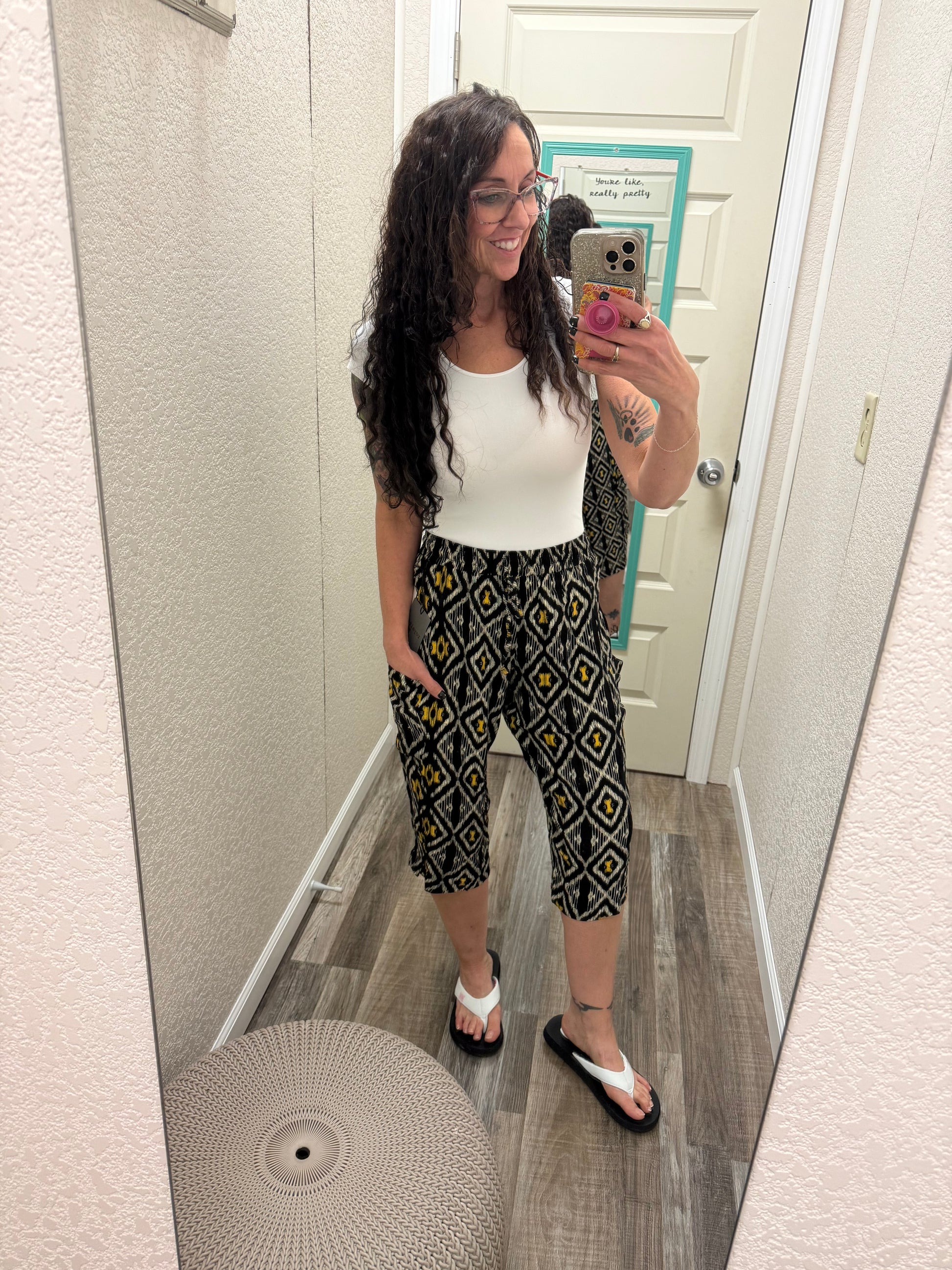 Elevate your summer style with these Missy High-Rise Pull-On Skimmers. Crafted from lightweight, breathable fabric, they're designed for all-day comfort and movement. The high-rise silhouette pairs with an elasticized waistband and drawstring for a secure, customizable fit. Practical side panel pockets keep your essentials within reach. The relaxed cut falls just below the knee with a clean hem, making them perfect for casual outings, weekend getaways, or laid-back days at home. Effortless, comfortable, and versatile—your new summer essential.