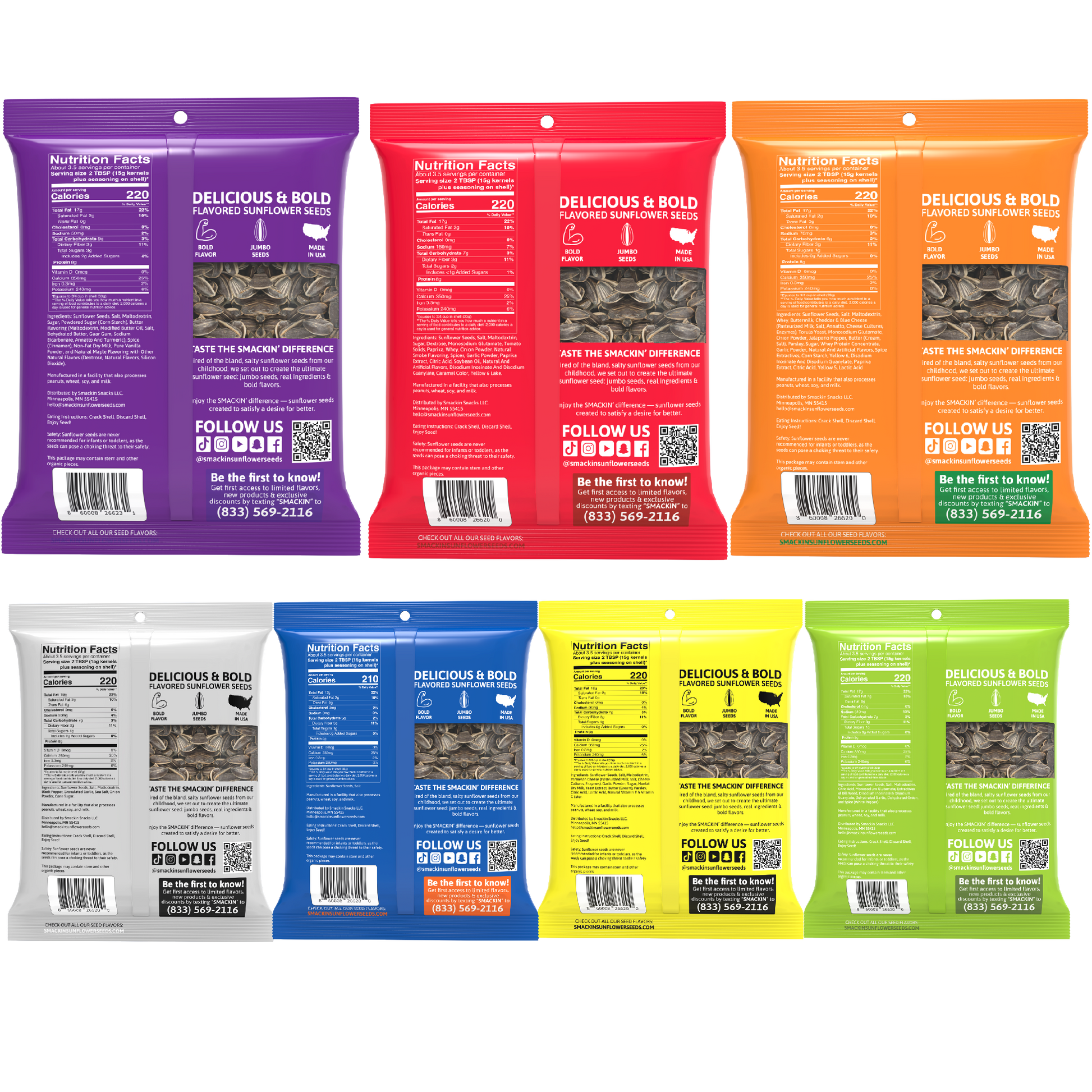 SMACKIN' roasts and flavors jumbo sunflower seeds to perfection in the USA. We don't settle for mediocre seeds with questionable ingredients, so we set out to create the best seeds ever. A better tasting and better-for-you snack, you can enjoy an entire bag without the sandpaper tongue.