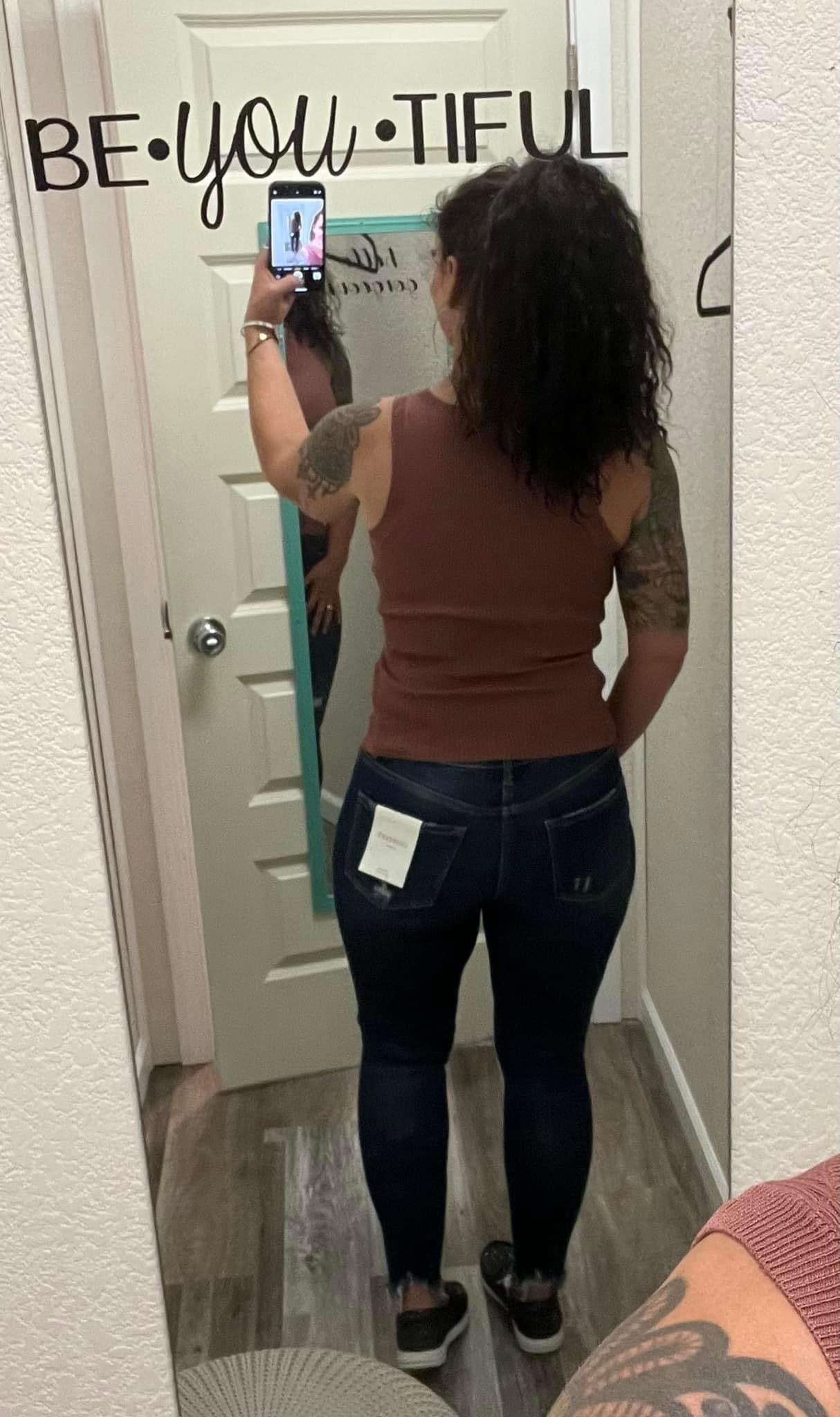 Wears: a Medium top and 7 in most jeans