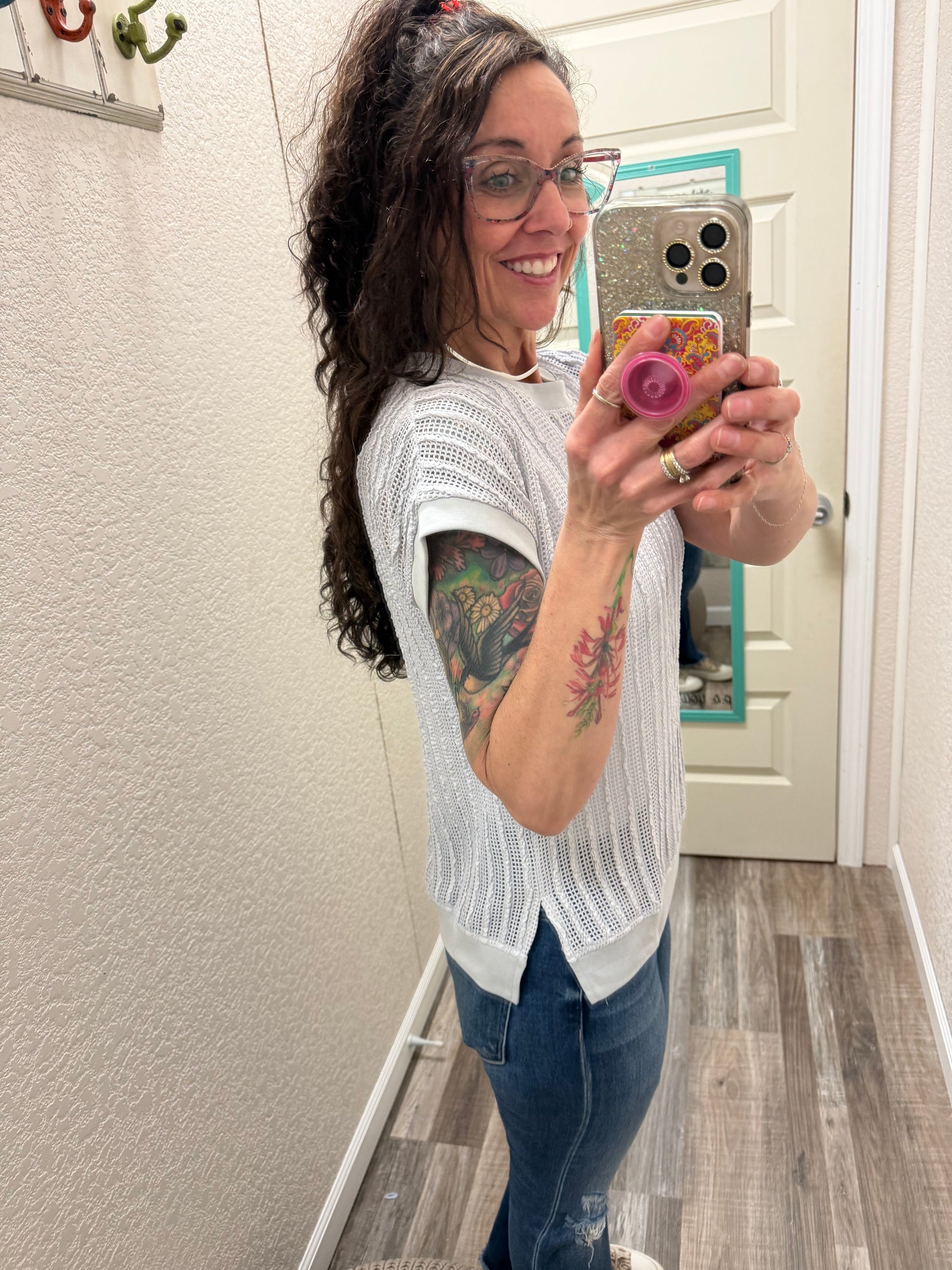 Effortless style meets breathable comfort in this open knit short sleeve top. Featuring delicate vertical stripes and a relaxed fit, the see-through weave creates an airy, laid-back look perfect for warm weather layering or solo wear. The loose silhouette drapes beautifully while maintaining its shape, making it an easy go-to for casual days and breezy evenings.