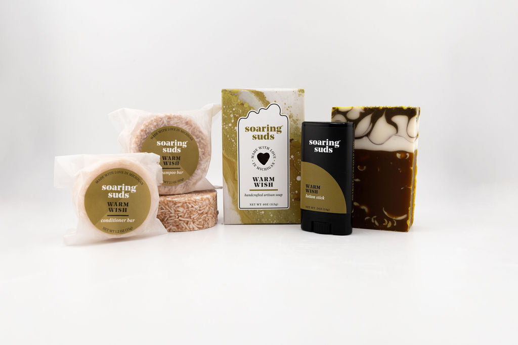 Includes: 1 Artisan soap bar, 1 Shampoo Bar, 1 Conditioner Bar, 1 Solid Lotion Stick, 1 Soap Saver Bag.