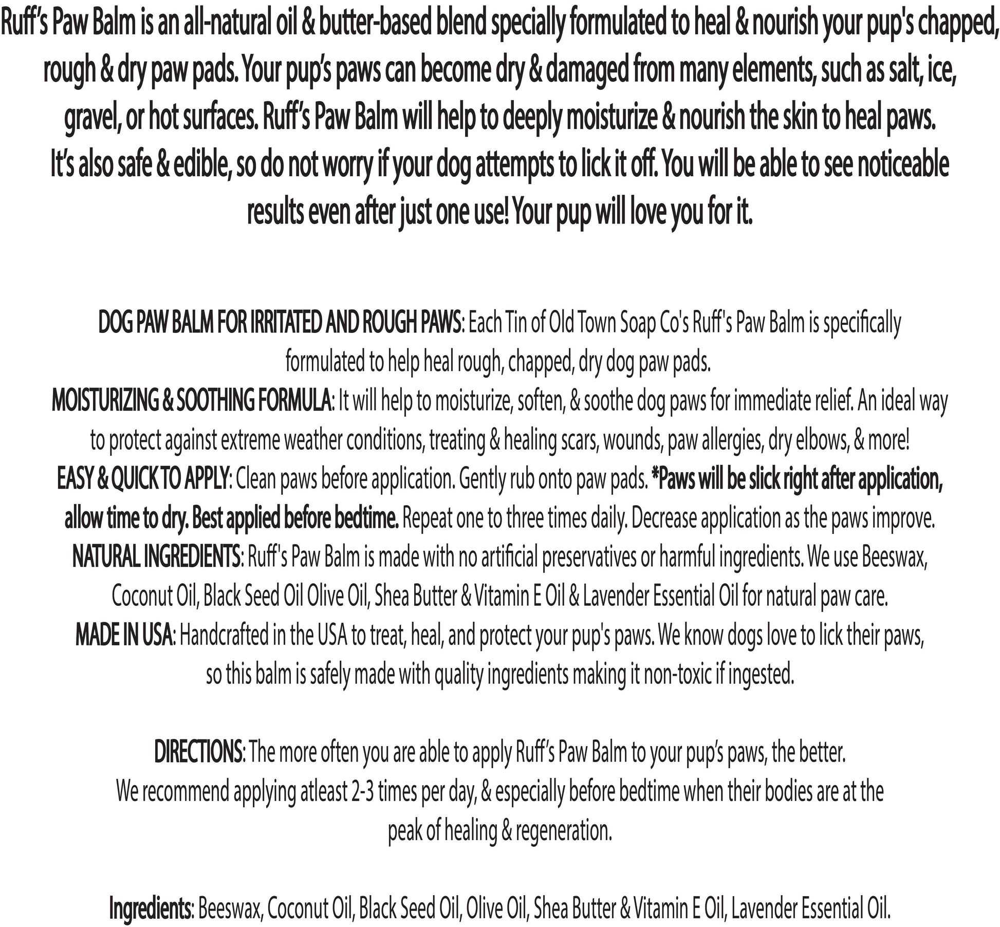 DOG PAW BALM FOR IRRITATED AND ROUGH PAWS: 2oz Tin of Old Town Soap Co's Paw Balm that is specifically formulated to heal rough, chapped, dry dog paw pads.