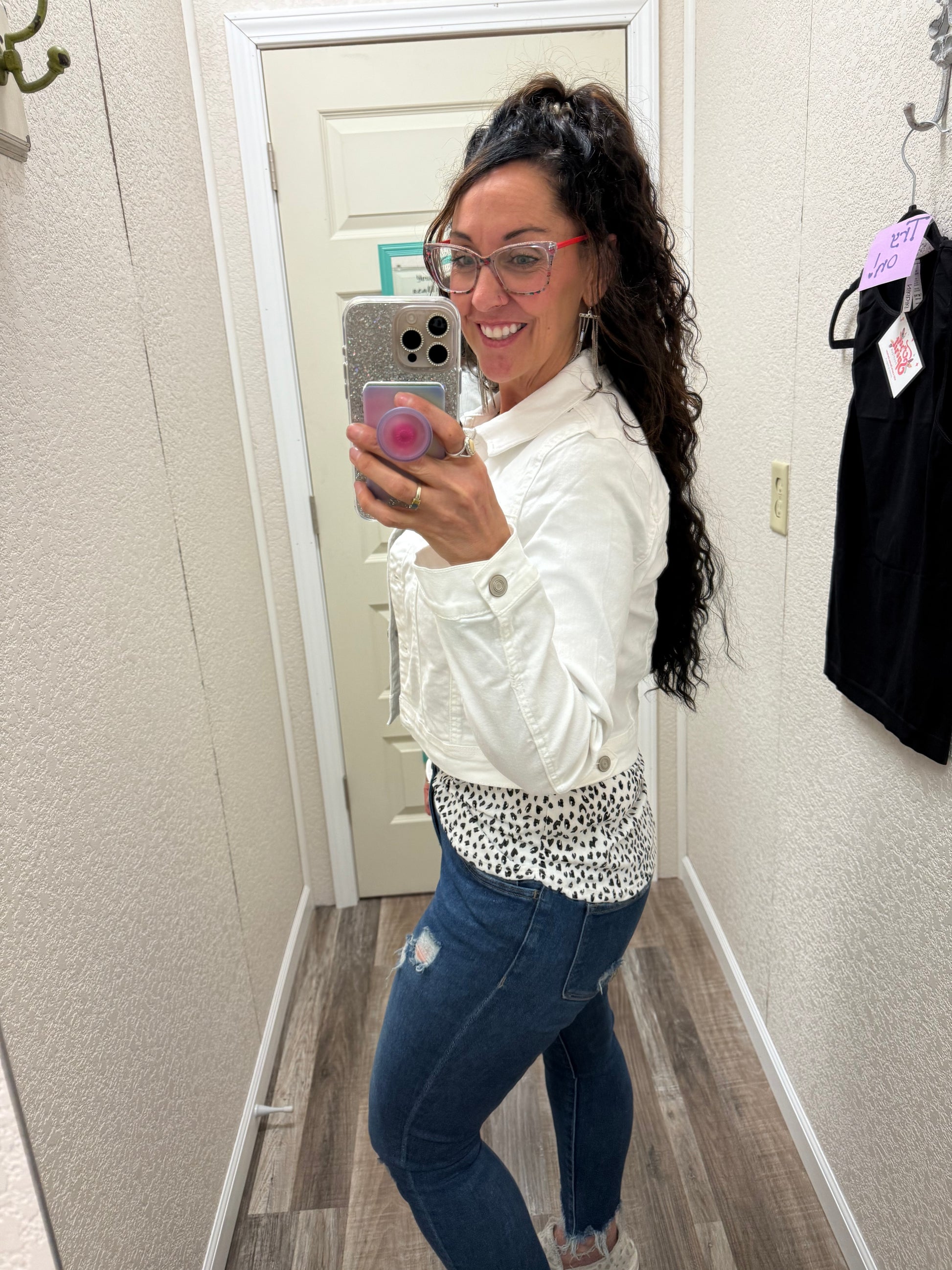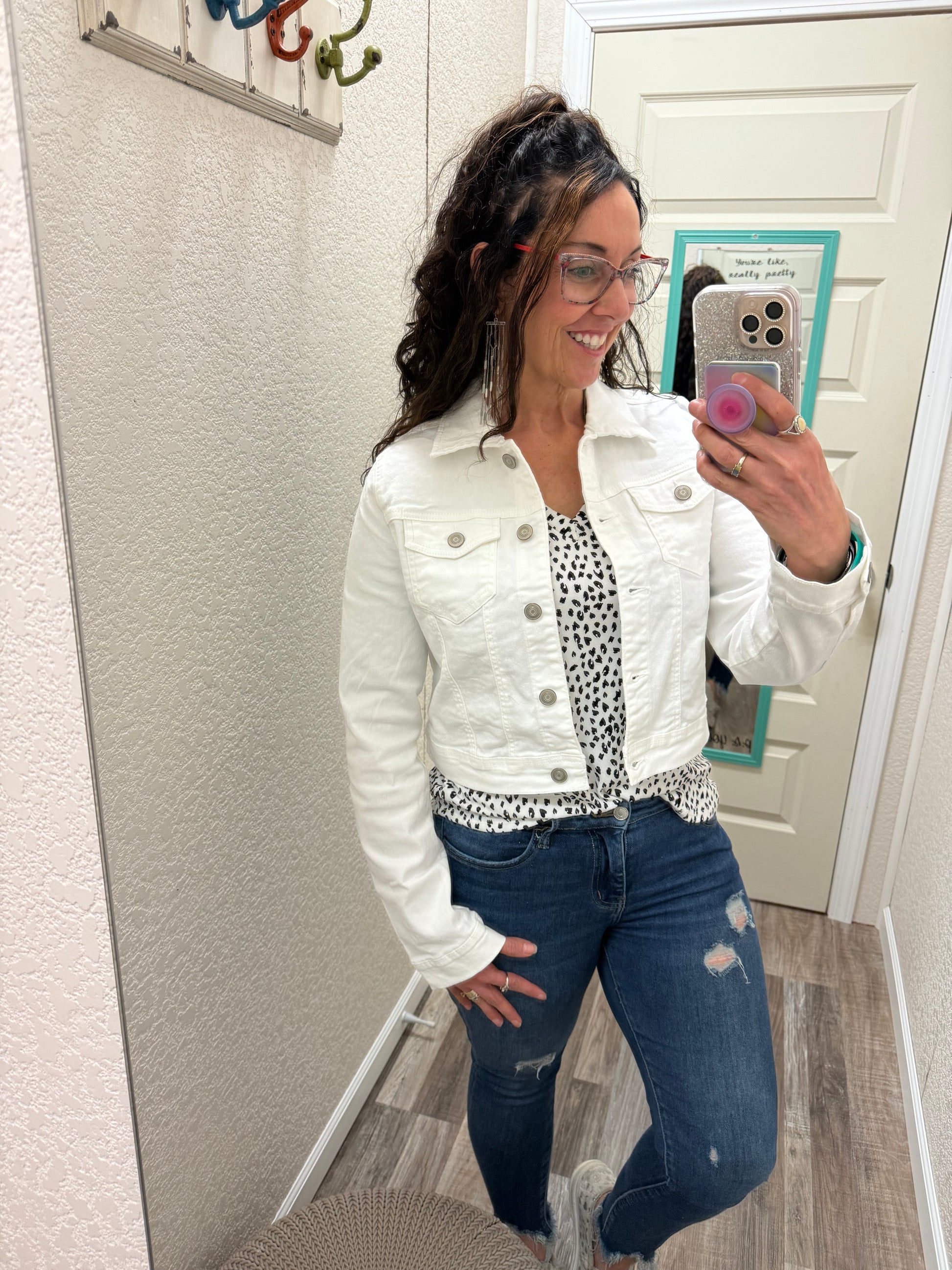 Upgrade your wardrobe with our Winona White Jean Jacket. Designed with stretchy fabric, it provides a true to size fit for added comfort. Experience the perfect blend of style and ease with this must-have addition to your collection.