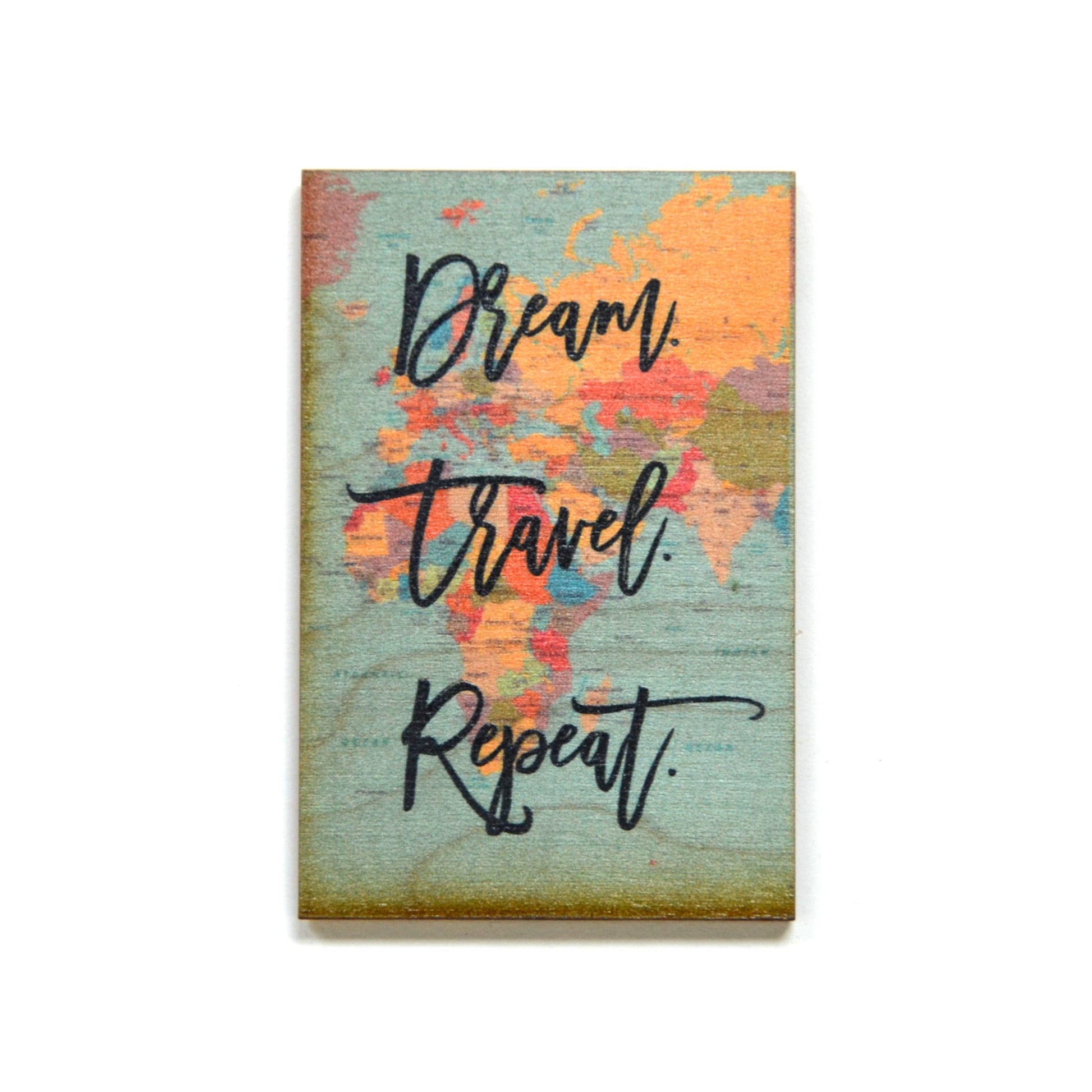 Travel Series wood magnet with "Dream Travel Repeat."