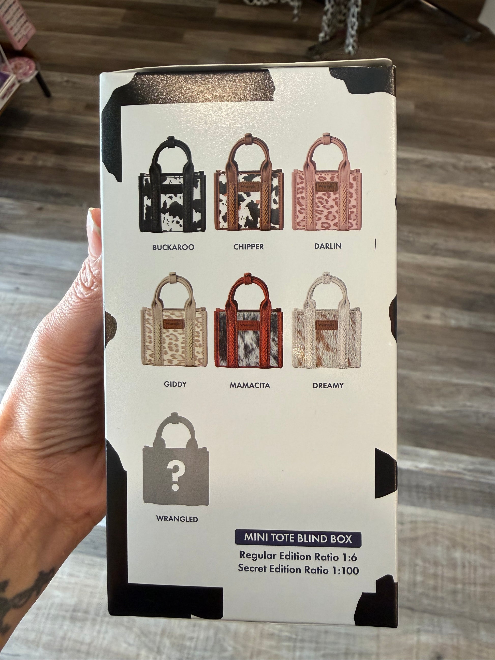 The Wrangler Mini Fun Size Tote features a unique mystery bag charm that adds a playful element to its design. This compact tote offers practicality for everyday use while serving as a stylish accessory, catering to both functionality and aesthetic appeal in modern fashion.